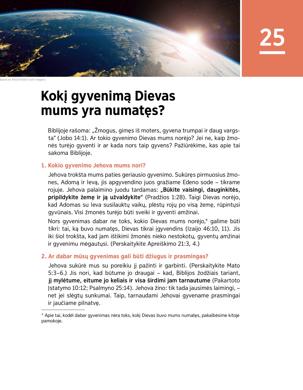 Nors gyvenimas dabar ne toks, kokio Dievas mums norėjo,a galime būti tikri: tai, ką buvo numatęs, Dievas tikrai įgyvendins (Izaijo 46:10, 11). Jis iki šiol trokšta, kad jam ištikimi žmonės nieko nestokotų, gyventų amžinai ir gyvenimu mėgautųsi. (Perskaitykite Apreiškimo 21:3, 4.)