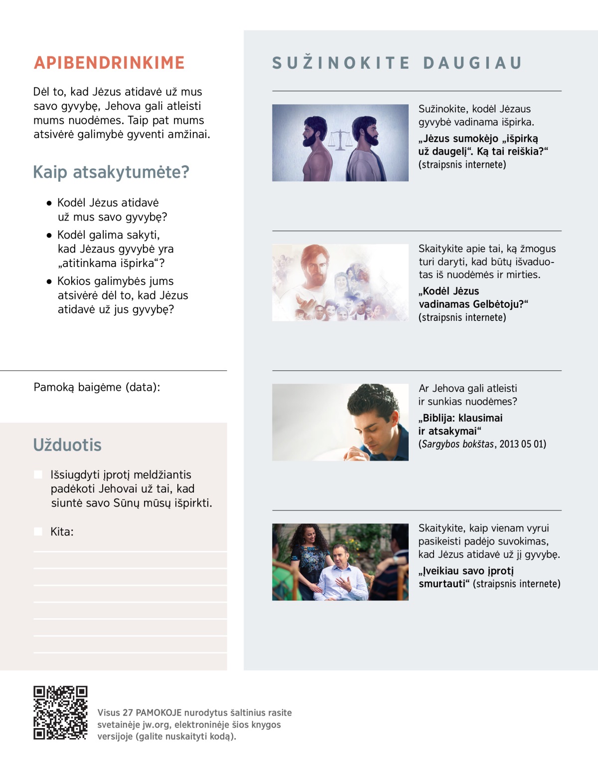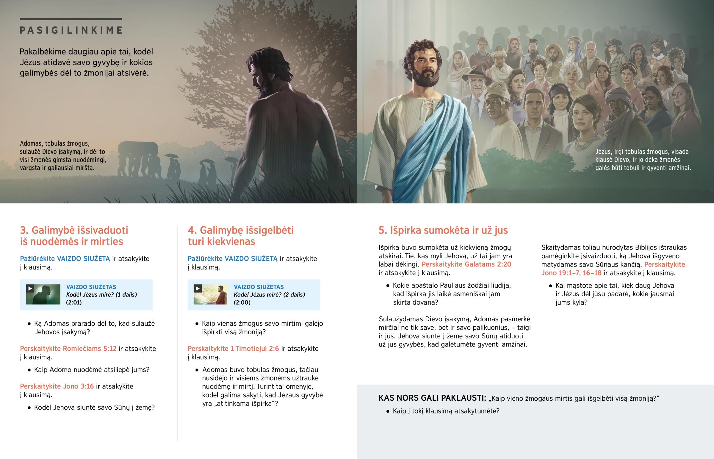 Dėl to, kad Adomas su Ieva sulaužė Dievo įsakymą, mes visi gimstame su nuodėme, vargstame ir galiausiai mirštame.a Tačiau mūsų padėtis nėra beviltiška. Jehova siuntė į žemę savo Sūnų, Jėzų Kristų, kad suteiktų mums galimybę iš nuodėmės ir mirties išsivaduoti. Skaitydami Bibliją sužinome, kad Jėzus mus išpirko – sumokėjo už mus didžiulę kainą. Kokią? Jis atidavė savo gyvybę. (Perskaitykite Mato 20:28.) Nors Jėzus buvo tobulas žmogus ir žemėje būtų galėjęs gyventi amžinai, jis sutiko mirti, kad mes galėtume atgauti viską, ką prarado Adomas su Ieva. Jėzus parodė, kaip stipriai jis ir Jehova mus myli. Mintys, aptariamos šioje pamokoje, paskatins mus dar labiau vertinti tai, ką Jėzus dėl mūsų padarė.