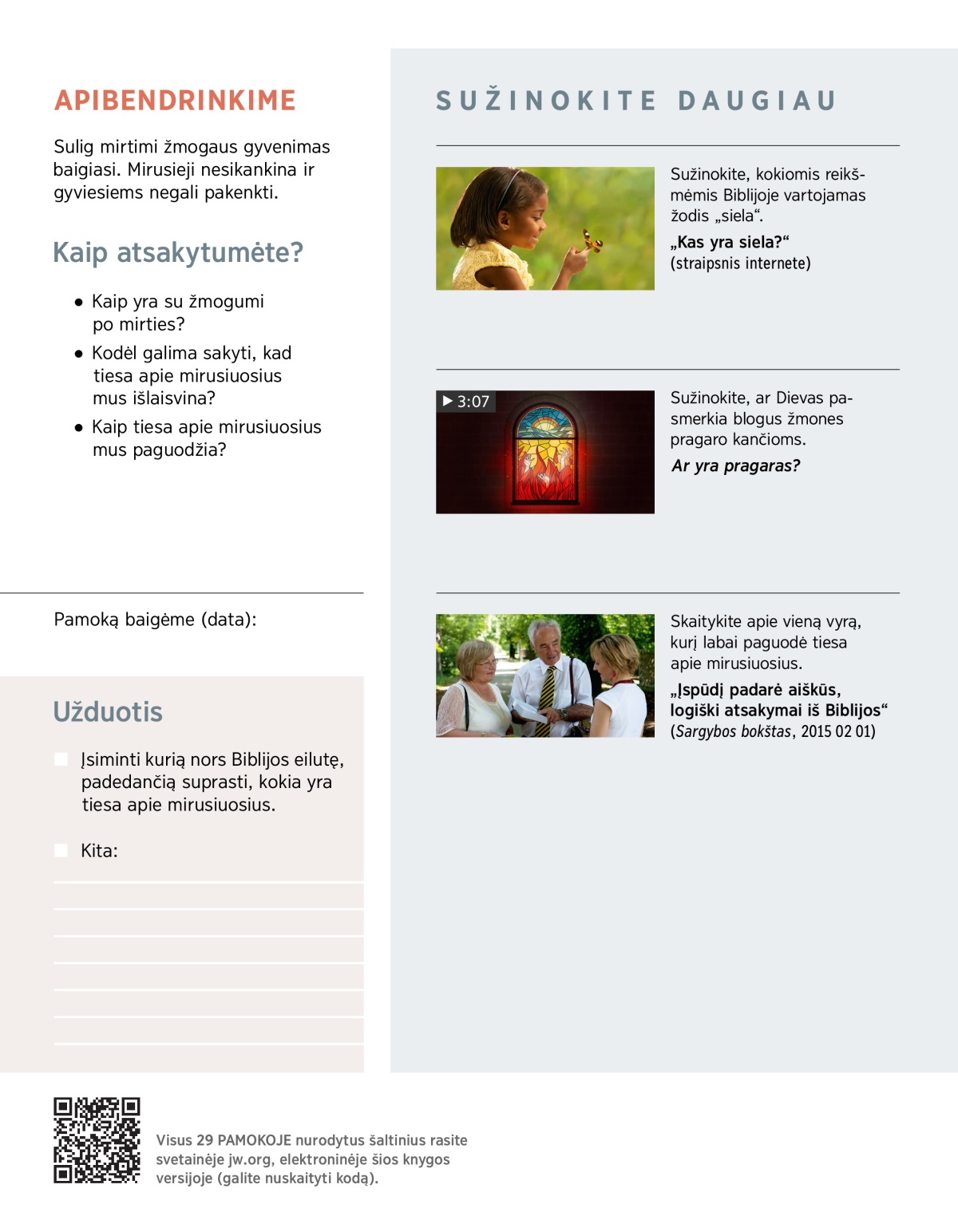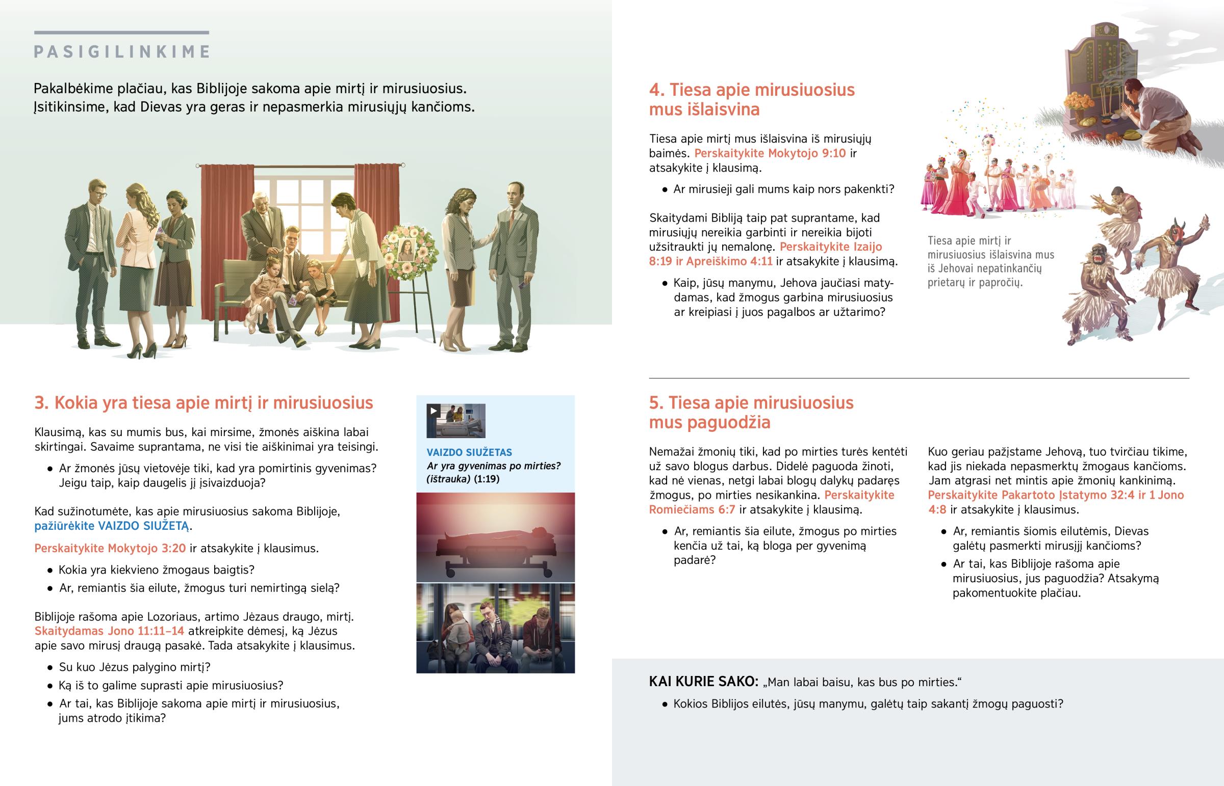 Ar esate netekęs artimo žmogaus? Jei taip, galbūt kartais pamąstote: „Kur jis dabar? Ar kada nors jį pamatysiu?“ Šioje ir kitoje pamokoje pakalbėsime, kas apie mirtį ir mirusiuosius sakoma Biblijoje. Tai, ką sužinosite, gali jus nuraminti ir paguosti.