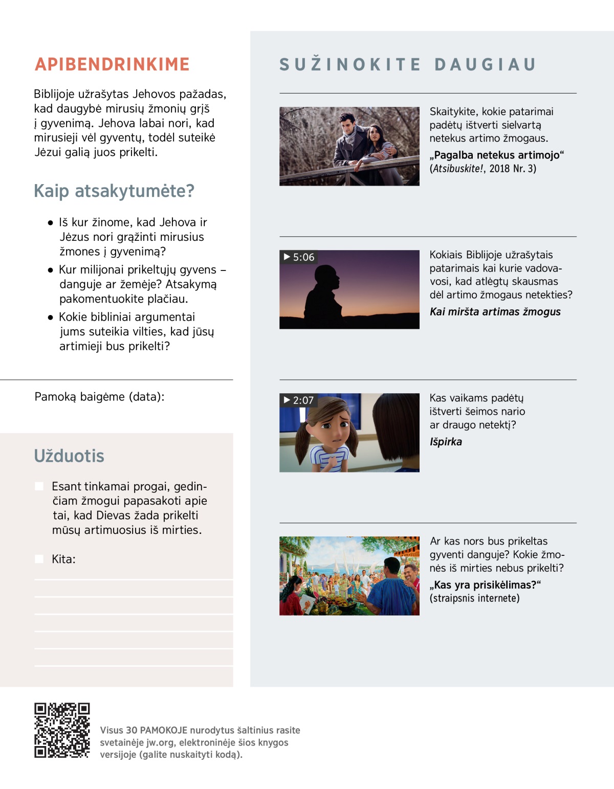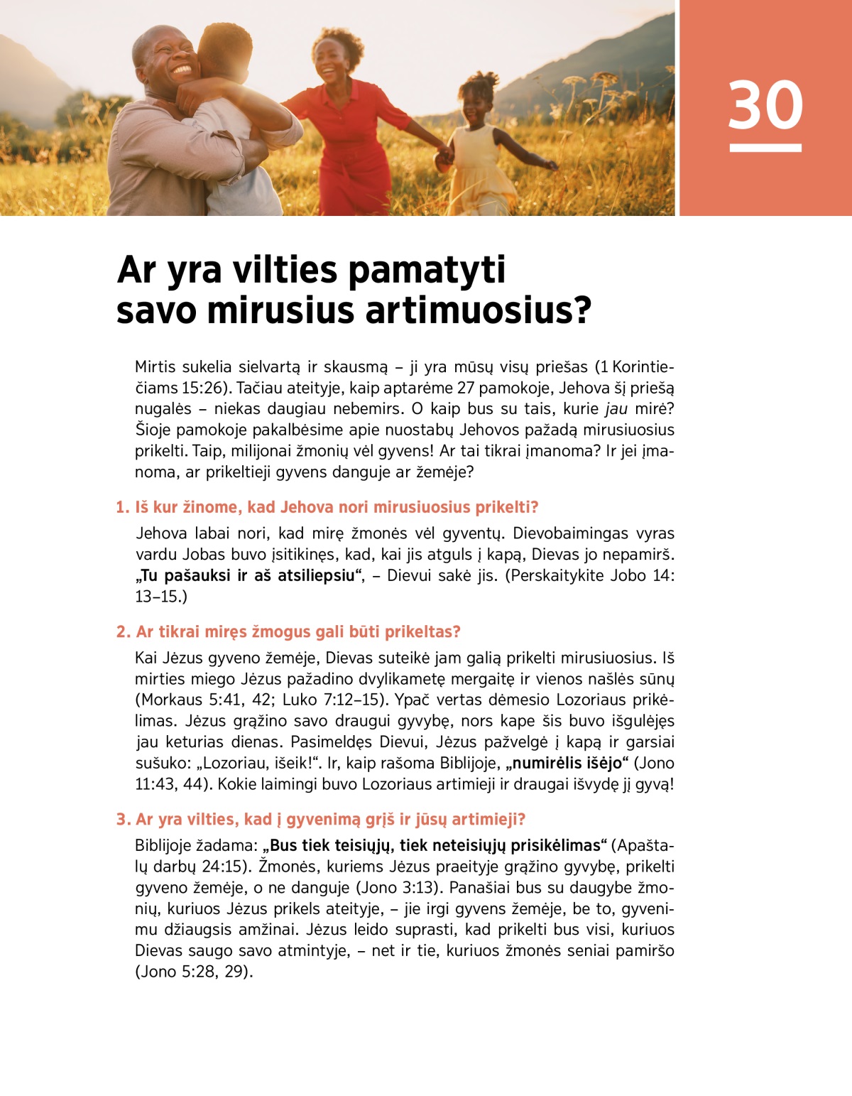 Mirtis sukelia sielvartą ir skausmą – ji yra mūsų visų priešas (1 Korintiečiams 15:26). Tačiau ateityje, kaip aptarėme 27 pamokoje, Jehova šį priešą nugalės – niekas daugiau nebemirs. O kaip bus su tais, kurie jau mirė? Šioje pamokoje pakalbėsime apie nuostabų Jehovos pažadą mirusiuosius prikelti. Taip, milijonai žmonių vėl gyvens! Ar tai tikrai įmanoma? Ir jei įmanoma, ar prikeltieji gyvens danguje ar žemėje?