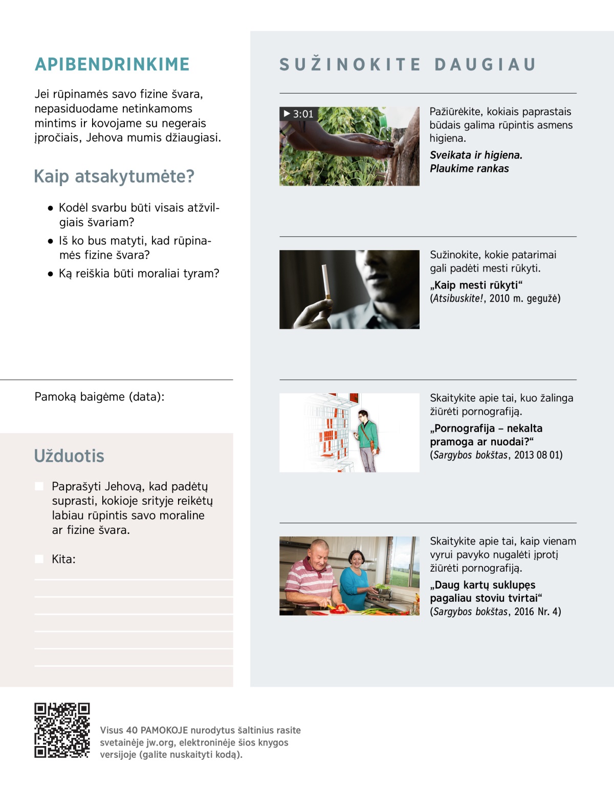 Ko dar reikia, kad būtume fiziškai ir moraliai švarūs? Jei vengsime žalingų įpročių, pavyzdžiui, nerūkysime ir nevartosime kvaišalų, Dievui parodysime, kad branginame gyvybę ir saugome sveikatą. O moraliai švarūs būsime, jei, pavyzdžiui, kovosime su įpročiu masturbuotis ar žiūrėti pornografiją (Psalmyno 119:37; Efeziečiams 5:5). Nugalėti negerus įpročius gali būti nelengva, tačiau neabejokime: Jehova mums padės. (Perskaitykite Izaijo 41:13.)
