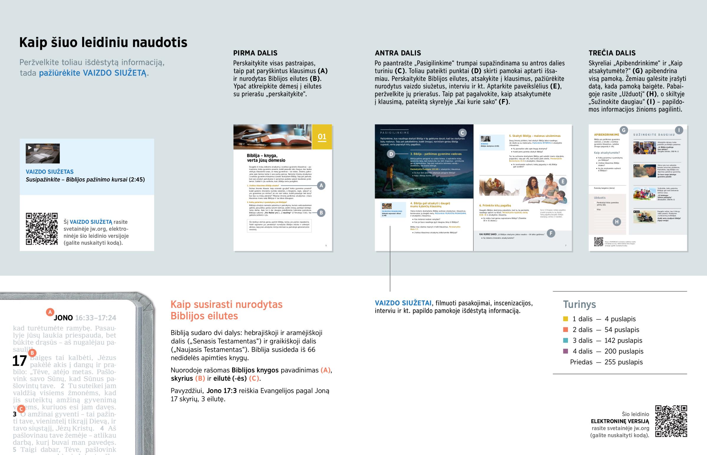 Perskaitykite visas pastraipas, taip pat paryškintus klausimus (A) ir nurodytas Biblijos eilutes (B). Ypač atkreipkite dėmesį į eilutes su prierašu „perskaitykite“.