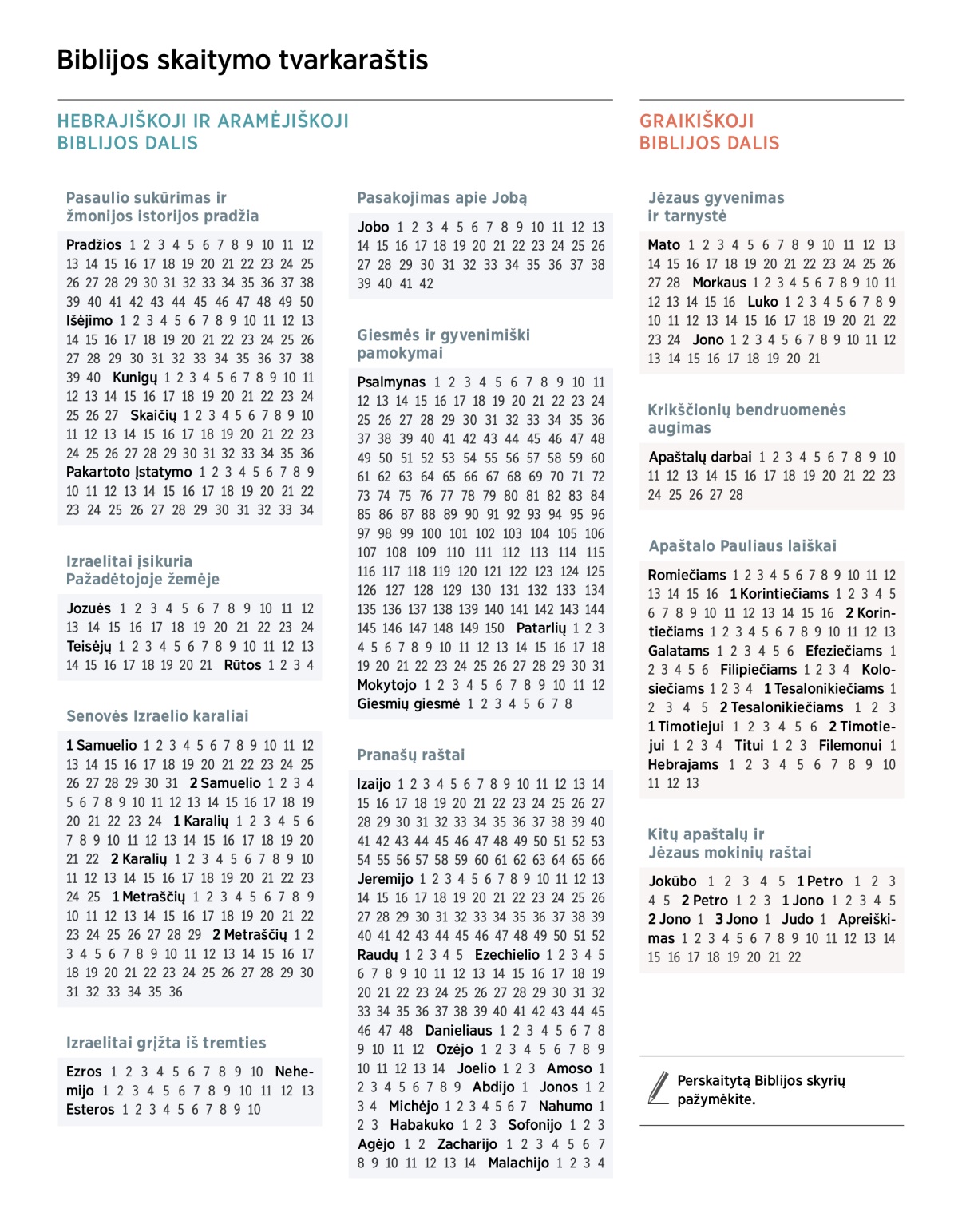 Biblijos skaitymo tvarkaraštis Spausdintas variantas Pasaulio sukūrimas ir žmonijos istorijos pradžia Izraelitai įsikuria Pažadėtojoje žemėje Senovės Izraelio karaliai Izraelitai grįžta iš tremties Pasakojimas apie Jobą Giesmės ir gyvenimiški pamokymai Pranašų raštai Jėzaus gyvenimas ir tarnystė Krikščionių bendruomenės augimas Apaštalo Pauliaus laiškai Kitų apaštalų ir Jėzaus mokinių raštai Perskaitytą Biblijos skyrių pažymėkite. HEBRAJIŠKOJI IR ARAMĖJIŠKOJI BIBLIJOS DALIS Pasaulio sukūrimas ir žmonijos istorijos pradžia Pradžios 1 2 3 4 5 6 7 8 9 10 11 12 13 14 15 16 17 18 19 20 21 22 23 24 25 26 27 28 29 30 31 32 33 34 35 36 37 38 39 40 41 42 43 44 45 46 47 48 49 50 Išėjimo 1 2 3 4 5 6 7 8 9 10 11 12 13 14 15 16 17 18 19 20 21 22 23 24 25 26 27 28 29 30 31 32 33 34 35 36 37 38 39 40 Kunigų 1 2 3 4 5 6 7 8 9 10 11 12 13 14 15 16 17 18 19 20 21 22 23 24 25 26 27 Skaičių 1 2 3 4 5 6 7 8 9 10 11 12 13 14 15 16 17 18 19 20 21 22 23 24 25 26 27 28 29 30 31 32 33 34 35 36 Pakartoto Įstatymo 1 2 3 4 5 6 7 8 9 10 11 12 13 14 15 16 17 18 19 20 21 22 23 24 25 26 27 28 29 30 31 32 33 34 Izraelitai įsikuria Pažadėtojoje žemėje Jozuės 1 2 3 4 5 6 7 8 9 10 11 12 13 14 15 16 17 18 19 20 21 22 23 24 Teisėjų 1 2 3 4 5 6 7 8 9 10 11 12 13 14 15 16 17 18 19 20 21 Rūtos 1 2 3 4 Senovės Izraelio karaliai 1 Samuelio 1 2 3 4 5 6 7 8 9 10 11 12 13 14 15 16 17 18 19 20 21 22 23 24 25 26 27 28 29 30 31 2 Samuelio 1 2 3 4 5 6 7 8 9 10 11 12 13 14 15 16 17 18 19 20 21 22 23 24 1 Karalių 1 2 3 4 5 6 7 8 9 10 11 12 13 14 15 16 17 18 19 20 21 22 2 Karalių 1 2 3 4 5 6 7 8 9 10 11 12 13 14 15 16 17 18 19 20 21 22 23 24 25 1 Metraščių 1 2 3 4 5 6 7 8 9 10 11 12 13 14 15 16 17 18 19 20 21 22 23 24 25 26 27 28 29 2 Metraščių 1 2 3 4 5 6 7 8 9 10 11 12 13 14 15 16 17 18 19 20 21 22 23 24 25 26 27 28 29 30 31 32 33 34 35 36 Izraelitai grįžta iš tremties Ezros 1 2 3 4 5 6 7 8 9 10 Nehemijo 1 2 3 4 5 6 7 8 9 10 11 12 13 Esteros 1 2 3 4 5 6 7 8 9 10 Pasakojimas apie Jobą Jobo 1 2 3 4 5 6 7 8 9 10 11 12 13 14 15 16 17 18 19 20 21 22 23 24 25 26 27 28 29 30 31 32 33 34 35 36 37 38 39 40 41 42 Giesmės ir gyvenimiški pamokymai Psalmynas 1 2 3 4 5 6 7 8 9 10 11 12 13 14 15 16 17 18 19 20 21 22 23 24 25 26 27 28 29 30 31 32 33 34 35 36 37 38 39 40 41 42 43 44 45 46 47 48 49 50 51 52 53 54 55 56 57 58 59 60 61 62 63 64 65 66 67 68 69 70 71 72 73 74 75 76 77 78 79 80 81 82 83 84 85 86 87 88 89 90 91 92 93 94 95 96 97 98 99 100 101 102 103 104 105 106 107 108 109 110 111 112 113 114 115 116 117 118 119 120 121 122 123 124 125 126 127 128 129 130 131 132 133 134 135 136 137 138 139 140 141 142 143 144 145 146 147 148 149 150 Patarlių 1 2 3 4 5 6 7 8 9 10 11 12 13 14 15 16 17 18 19 20 21 22 23 24 25 26 27 28 29 30 31 Mokytojo 1 2 3 4 5 6 7 8 9 10 11 12 Giesmių giesmė 1 2 3 4 5 6 7 8 Pranašų raštai Izaijo 1 2 3 4 5 6 7 8 9 10 11 12 13 14 15 16 17 18 19 20 21 22 23 24 25 26 27 28 29 30 31 32 33 34 35 36 37 38 39 40 41 42 43 44 45 46 47 48 49 50 51 52 53 54 55 56 57 58 59 60 61 62 63 64 65 66 Jeremijo 1 2 3 4 5 6 7 8 9 10 11 12 13 14 15 16 17 18 19 20 21 22 23 24 25 26 27 28 29 30 31 32 33 34 35 36 37 38 39 40 41 42 43 44 45 46 47 48 49 50 51 52 Raudų 1 2 3 4 5 Ezechielio 1 2 3 4 5 6 7 8 9 10 11 12 13 14 15 16 17 18 19 20 21 22 23 24 25 26 27 28 29 30 31 32 33 34 35 36 37 38 39 40 41 42 43 44 45 46 47 48 Danieliaus 1 2 3 4 5 6 7 8 9 10 11 12 Ozėjo 1 2 3 4 5 6 7 8 9 10 11 12 13 14 Joelio 1 2 3 Amoso 1 2 3 4 5 6 7 8 9 Abdijo 1 Jonos 1 2 3 4 Michėjo 1 2 3 4 5 6 7 Nahumo 1 2 3 Habakuko 1 2 3 Sofonijo 1 2 3 Agėjo 1 2 Zacharijo 1 2 3 4 5 6 7 8 9 10 11 12 13 14 Malachijo 1 2 3 4 GRAIKIŠKOJI BIBLIJOS DALIS Jėzaus gyvenimas ir tarnystė Mato 1 2 3 4 5 6 7 8 9 10 11 12 13 14 15 16 17 18 19 20 21 22 23 24 25 26 27 28 Morkaus 1 2 3 4 5 6 7 8 9 10 11 12 13 14 15 16 Luko 1 2 3 4 5 6 7 8 9 10 11 12 13 14 15 16 17 18 19 20 21 22 23 24 Jono 1 2 3 4 5 6 7 8 9 10 11 12 13 14 15 16 17 18 19 20 21 Krikščionių bendruomenės augimas Apaštalų darbai 1 2 3 4 5 6 7 8 9 10 11 12 13 14 15 16 17 18 19 20 21 22 23 24 25 26 27 28 Apaštalo Pauliaus laiškai Romiečiams 1 2 3 4 5 6 7 8 9 10 11 12 13 14 15 16 1 Korintiečiams 1 2 3 4 5 6 7 8 9 10 11 12 13 14 15 16 2 Korintiečiams 1 2 3 4 5 6 7 8 9 10 11 12 13 Galatams 1 2 3 4 5 6 Efeziečiams 1 2 3 4 5 6 Filipiečiams 1 2 3 4 Kolosiečiams 1 2 3 4 1 Tesalonikiečiams 1 2 3 4 5 2 Tesalonikiečiams 1 2 3 1 Timotiejui 1 2 3 4 5 6 2 Timotiejui 1 2 3 4 Titui 1 2 3 Filemonui 1 Hebrajams 1 2 3 4 5 6 7 8 9 10 11 12 13 Kitų apaštalų ir Jėzaus mokinių raštai Jokūbo 1 2 3 4 5 1 Petro 1 2 3 4 5 2 Petro 1 2 3 1 Jono 1 2 3 4 5 2 Jono 1 3 Jono 1 Judo 1 Apreiškimas 1 2 3 4 5 6 7 8 9 10 11 12 13 14 15 16 17 18 19 20 21 22