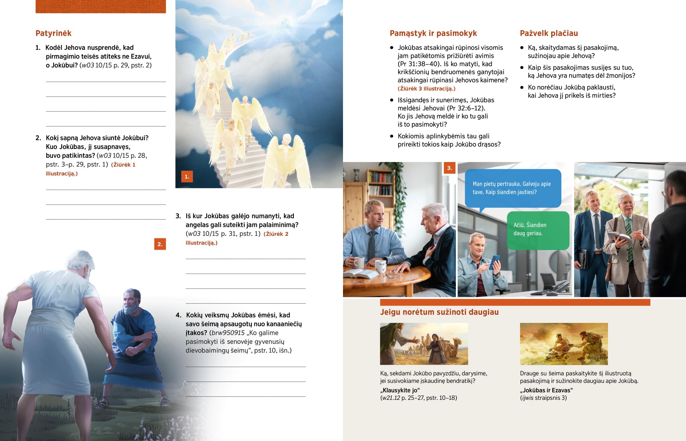 4. Kokių veiksmų Jokūbas ėmėsi, kad savo šeimą apsaugotų nuo kanaaniečių įtakos? (brw950915 „Ko galime pasimokyti iš senovėje gyvenusių dievobaimingų šeimų“, pstr. 10, išn.)