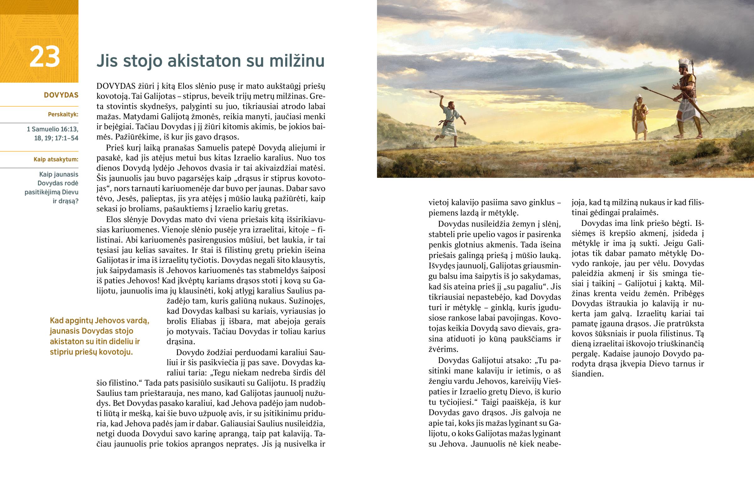 DOVYDAS žiūri į kitą Elos slėnio pusę ir mato aukštaūgį priešų kovotoją. Tai Galijotas – stiprus, beveik trijų metrų milžinas. Greta stovintis skydnešys, palyginti su juo, tikriausiai atrodo labai mažas. Matydami Galijotą žmonės, reikia manyti, jaučiasi menki ir bejėgiai. Tačiau Dovydas į jį žiūri kitomis akimis, be jokios baimės. Pažiūrėkime, iš kur jis gavo drąsos.