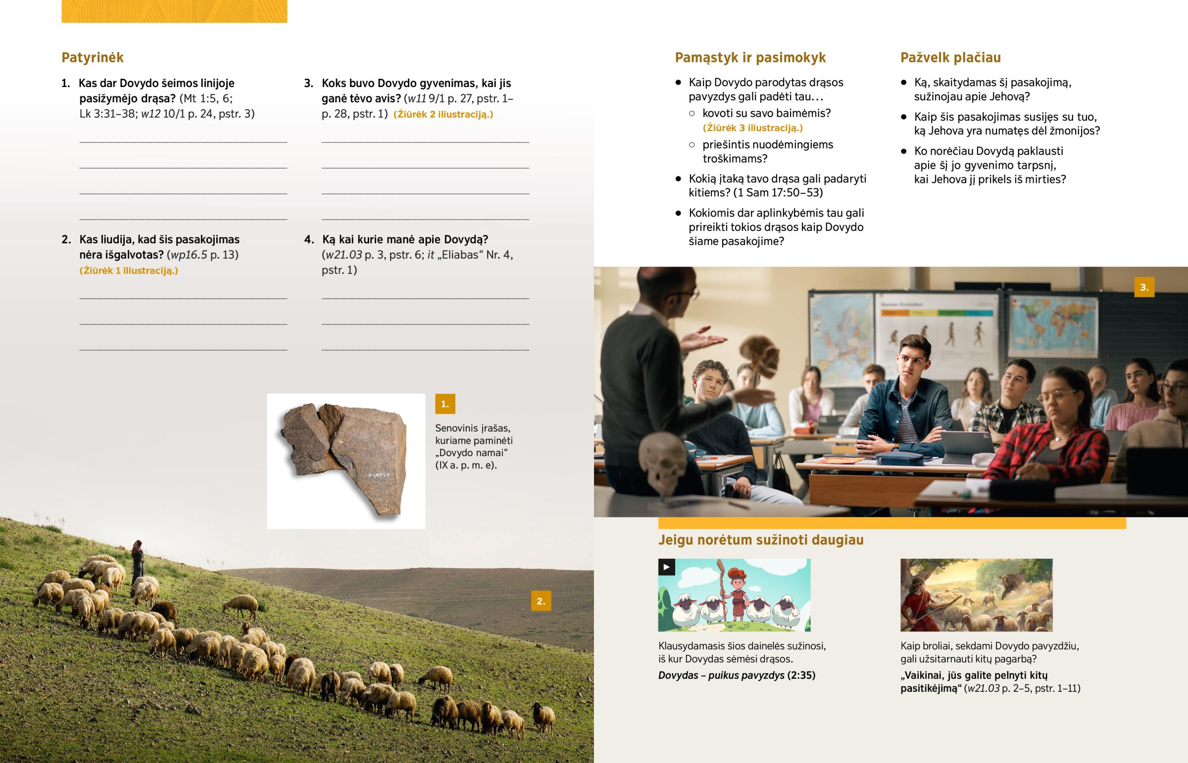 3. Koks buvo Dovydo gyvenimas, kai jis ganė tėvo avis? (w11 9/1 p. 27, pstr. 1–p. 28, pstr. 1) (Žiūrėk 2 iliustraciją.)