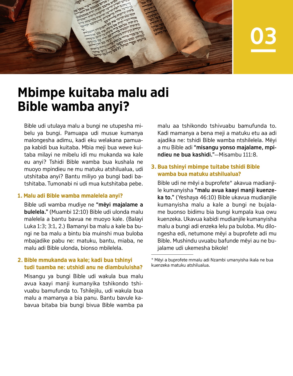 Misangu ya bungi Bible udi wakula bua malu avua kaayi manji kumanyika tshikondo tshivuabu bamufunda to. Tshilejilu, udi wakula bua malu a mamanya a bia panu. Bantu bavule kabavua bitaba bia bungi bivua Bible wamba pa malu aa tshikondo tshivuabu bamufunda to. Kadi mamanya a bena meji a matuku etu aa adi ajadika ne: tshidi Bible wamba ntshilelela. Mêyi a mu Bible adi “misangu yonso majalame, mpindieu ne bua kashidi.”—Misambu 111:8.