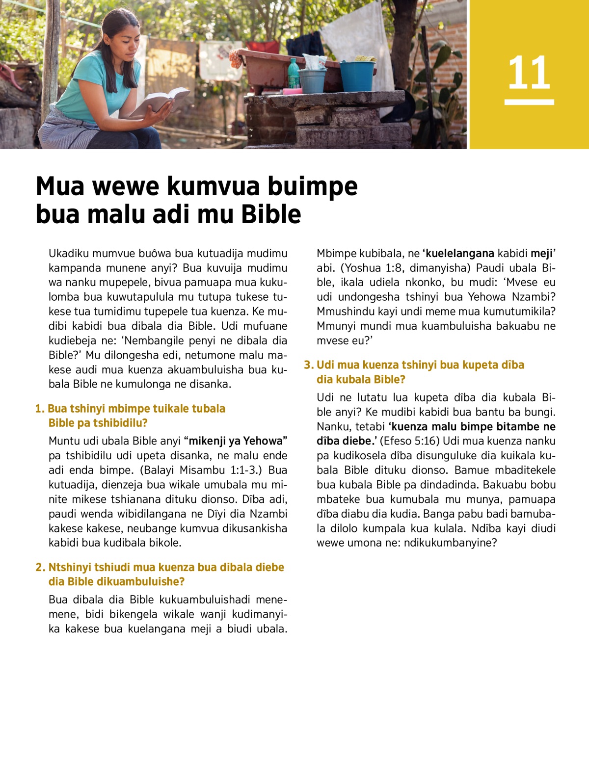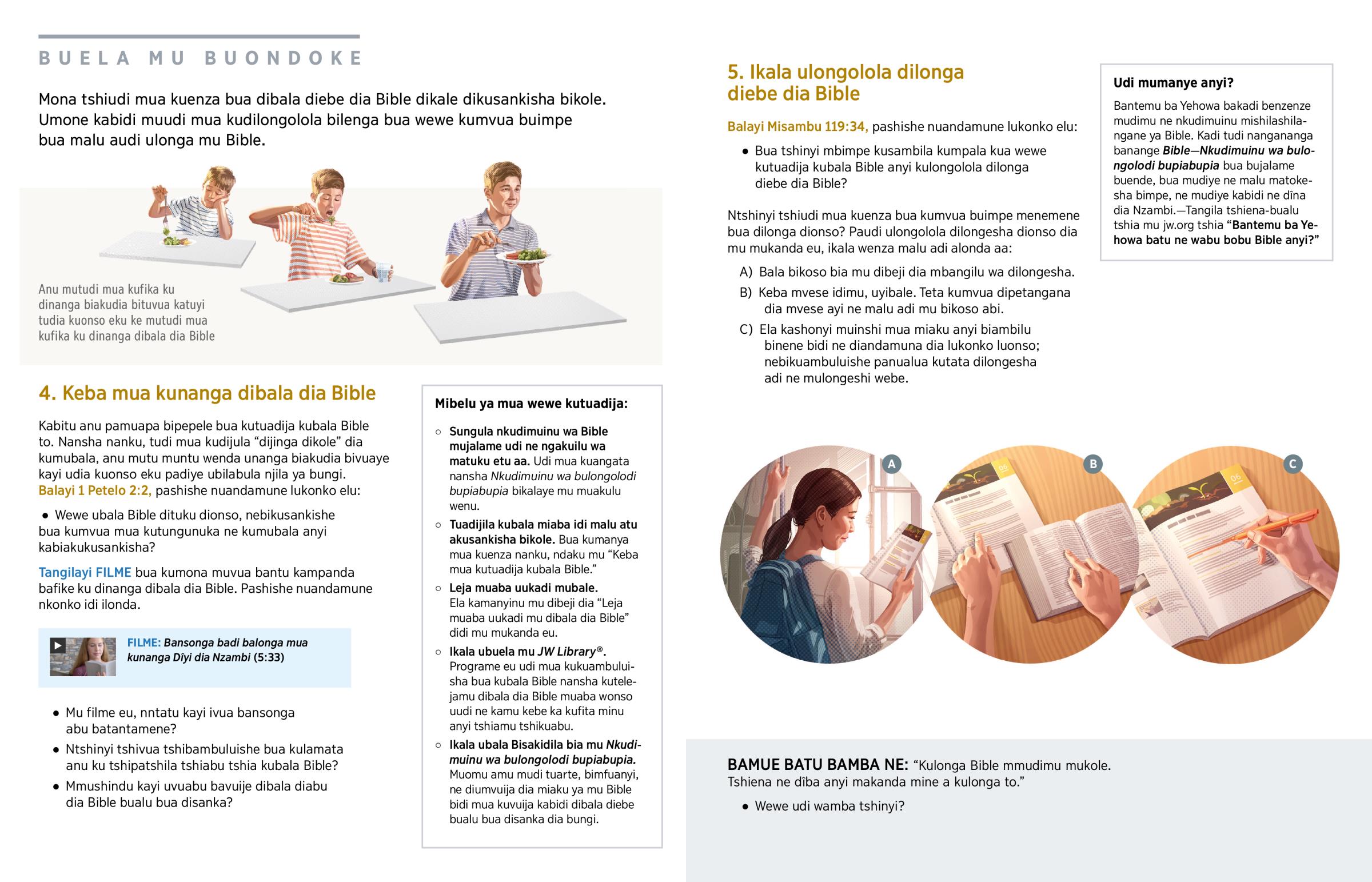 Bua dibala dia Bible kukuambuluishadi menemene, bidi bikengela wikale wanji kudimanyika kakese bua kuelangana meji a biudi ubala. Mbimpe kubibala, ne ‘kuelelangana kabidi meji’ abi. (Yoshua 1:8, dimanyisha) Paudi ubala Bible, ikala udiela nkonko, bu mudi: ‘Mvese eu udi undongesha tshinyi bua Yehowa Nzambi? Mmushindu kayi undi meme mua kumutumikila? Mmunyi mundi mua kuambuluisha bakuabu ne mvese eu?’
