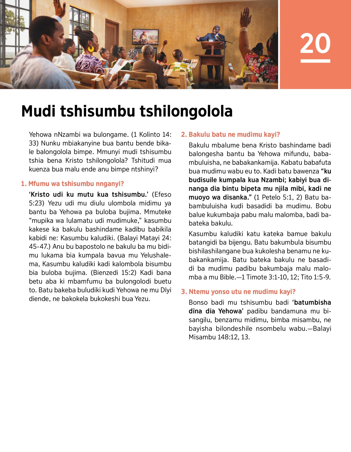Bakulu mbalume bena Kristo bashindame badi balongesha bantu ba Yehowa mifundu, babambuluisha, ne babakankamija. Kabatu babafuta bua mudimu wabu eu to. Kadi batu bawenza “ku budisuile kumpala kua Nzambi; kabiyi bua dinanga dia bintu bipeta mu njila mibi, kadi ne muoyo wa disanka.” (1 Petelo 5:1, 2) Batu babambuluisha kudi basadidi ba mudimu. Bobu balue kukumbaja pabu malu malomba, badi babateka bakulu.