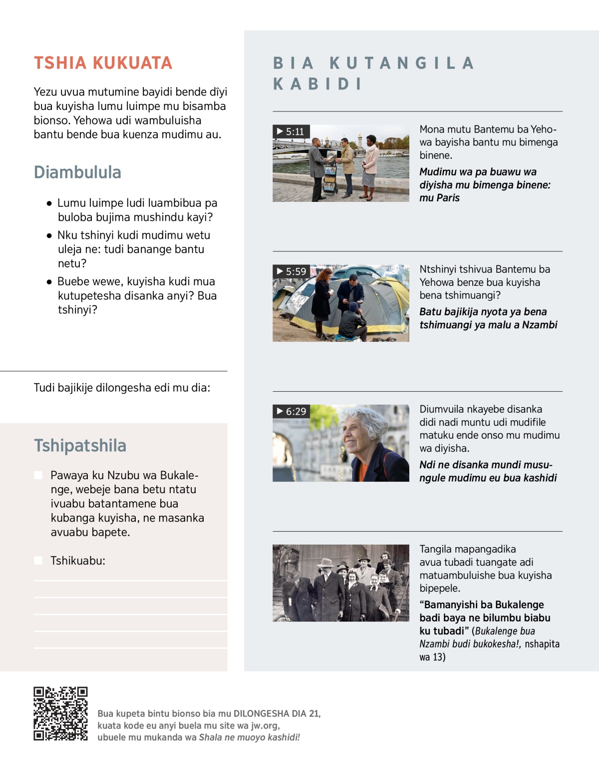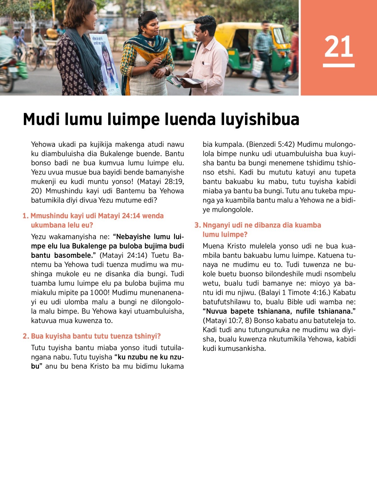 Muena Kristo mulelela yonso udi ne bua kuambila bantu bakuabu lumu luimpe. Katuena tunaya ne mudimu eu to. Tudi tuwenza ne bukole buetu buonso bilondeshile mudi nsombelu wetu, bualu tudi bamanye ne: mioyo ya bantu idi mu njiwu. (Balayi 1 Timote 4:16.) Kabatu batufutshilawu to, bualu Bible udi wamba ne: “Nuvua bapete tshianana, nufile tshianana.” (Matayi 10:7, 8) Bonso kabatu anu batuteleja to. Kadi tudi anu tutungunuka ne mudimu wa diyisha, bualu kuwenza nkutumikila Yehowa, kabidi kudi kumusankisha.