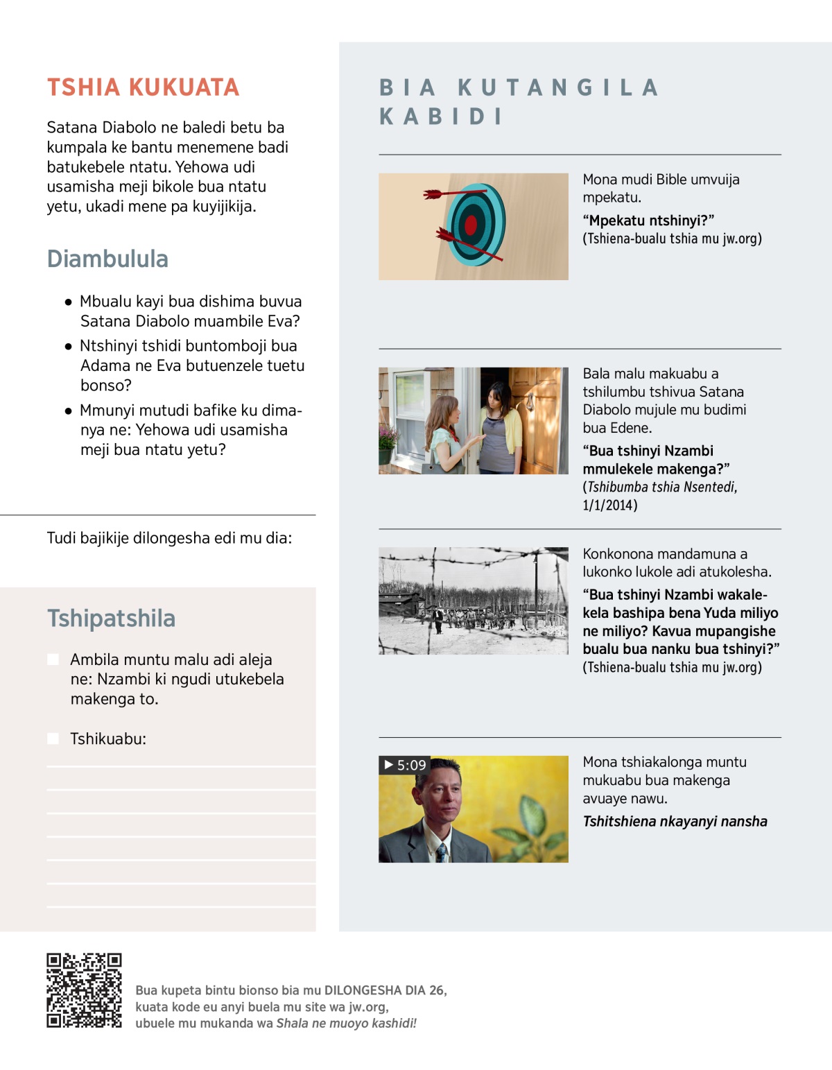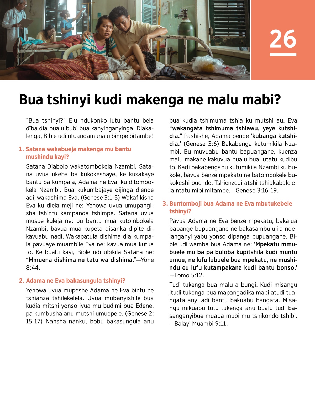 Yehowa uvua mupeshe Adama ne Eva bintu ne tshianza tshilekelela. Uvua mubanyishile bua kudia mitshi yonso ivua mu budimi bua Edene, pa kumbusha anu mutshi umuepele. (Genese 2:15-17) Nansha nanku, bobu bakasungula anu bua kudia tshimuma tshia ku mutshi au. Eva “wakangata tshimuma tshiawu, yeye kutshidia.” Pashishe, Adama pende ‘kubanga kutshidia.’ (Genese 3:6) Bakabenga kutumikila Nzambi. Bu muvuabu bantu bapuangane, kuenza malu makane kakuvua bualu bua lutatu kudibu to. Kadi pakabengabu kutumikila Nzambi ku bukole, bavua benze mpekatu ne batombokele bukokeshi buende. Tshienzedi atshi tshiakabalelela ntatu mibi mitambe.—Genese 3:16-19.