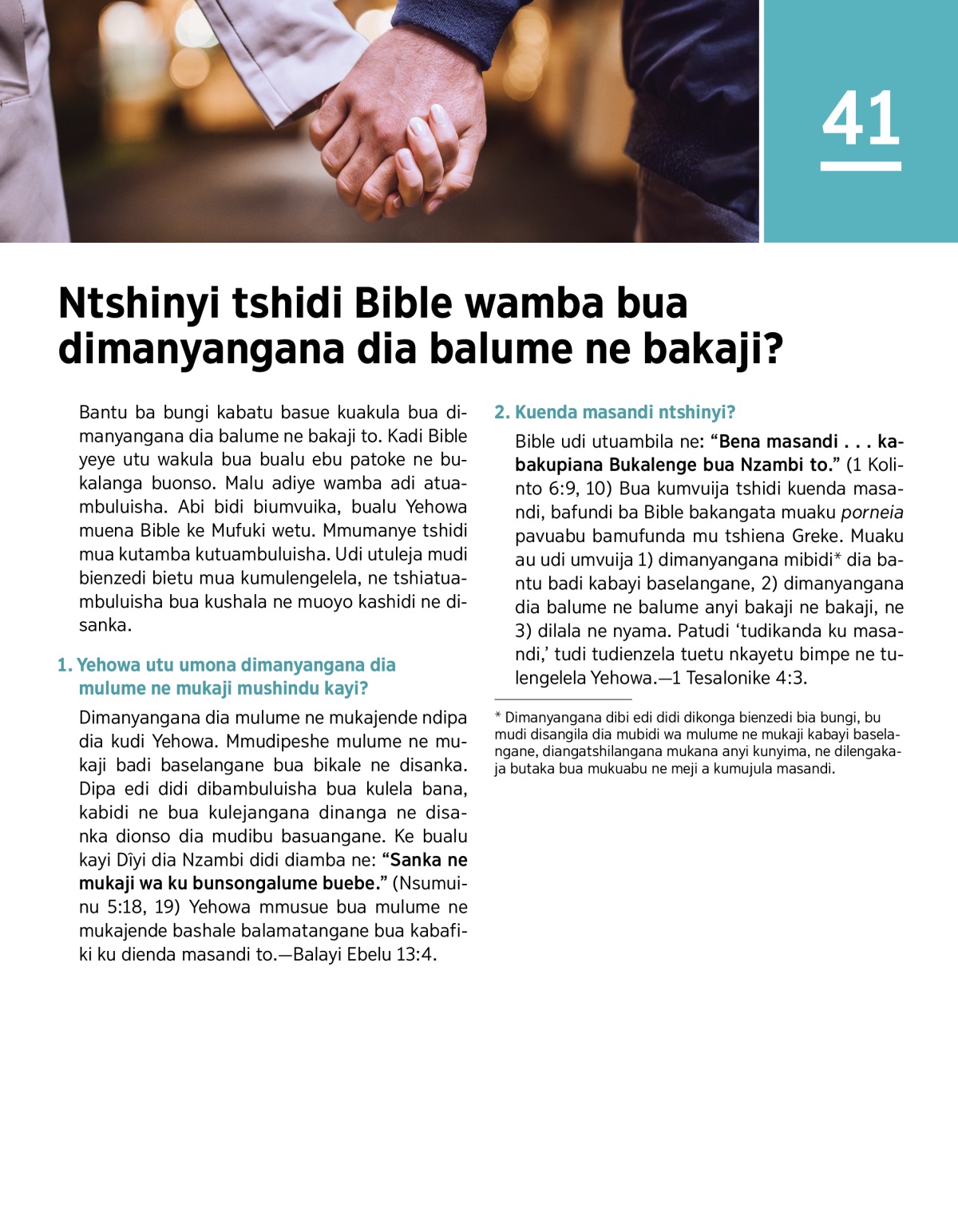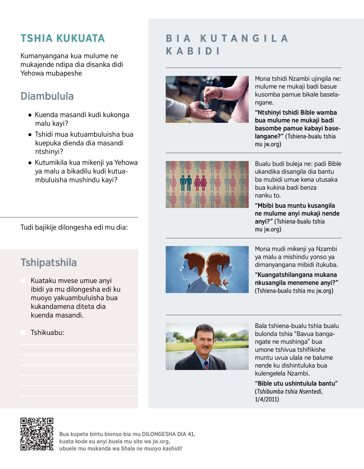 “Mbibi bua muntu kusangila ne mulume anyi mukaji nende anyi?” (Tshiena-bualu tshia mu jw.org)