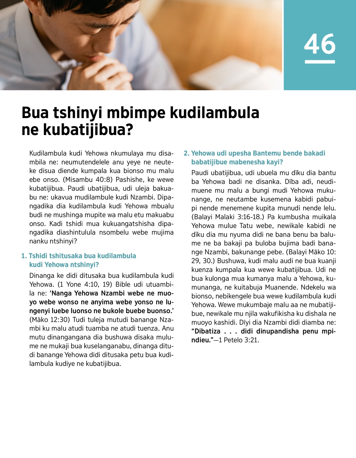 Paudi ubatijibua, udi ubuela mu dîku dia bantu ba Yehowa badi ne disanka. Dîba adi, neudimuene mu malu a bungi mudi Yehowa mukunange, ne neutambe kusemena kabidi pabuipi nende menemene kupita munudi nende lelu. (Balayi Malaki 3:16-18.) Pa kumbusha muikala Yehowa mulue Tatu webe, newikale kabidi ne dîku dia mu nyuma didi ne bana benu ba balume ne ba bakaji pa buloba bujima badi banange Nzambi, bakunange pebe. (Balayi Mâko 10:29, 30.) Bushuwa, kudi malu audi ne bua kuanji kuenza kumpala kua wewe kubatijibua. Udi ne bua kulonga mua kumanya malu a Yehowa, kumunanga, ne kuitabuja Muanende. Ndekelu wa bionso, nebikengele bua wewe kudilambula kudi Yehowa. Wewe mukumbaje malu aa ne mubatijibue, newikale mu njila wakufikisha ku dishala ne muoyo kashidi. Dîyi dia Nzambi didi diamba ne: “Dibatiza . . . didi dinupandisha penu mpindieu.”​—1 Petelo 3:21.