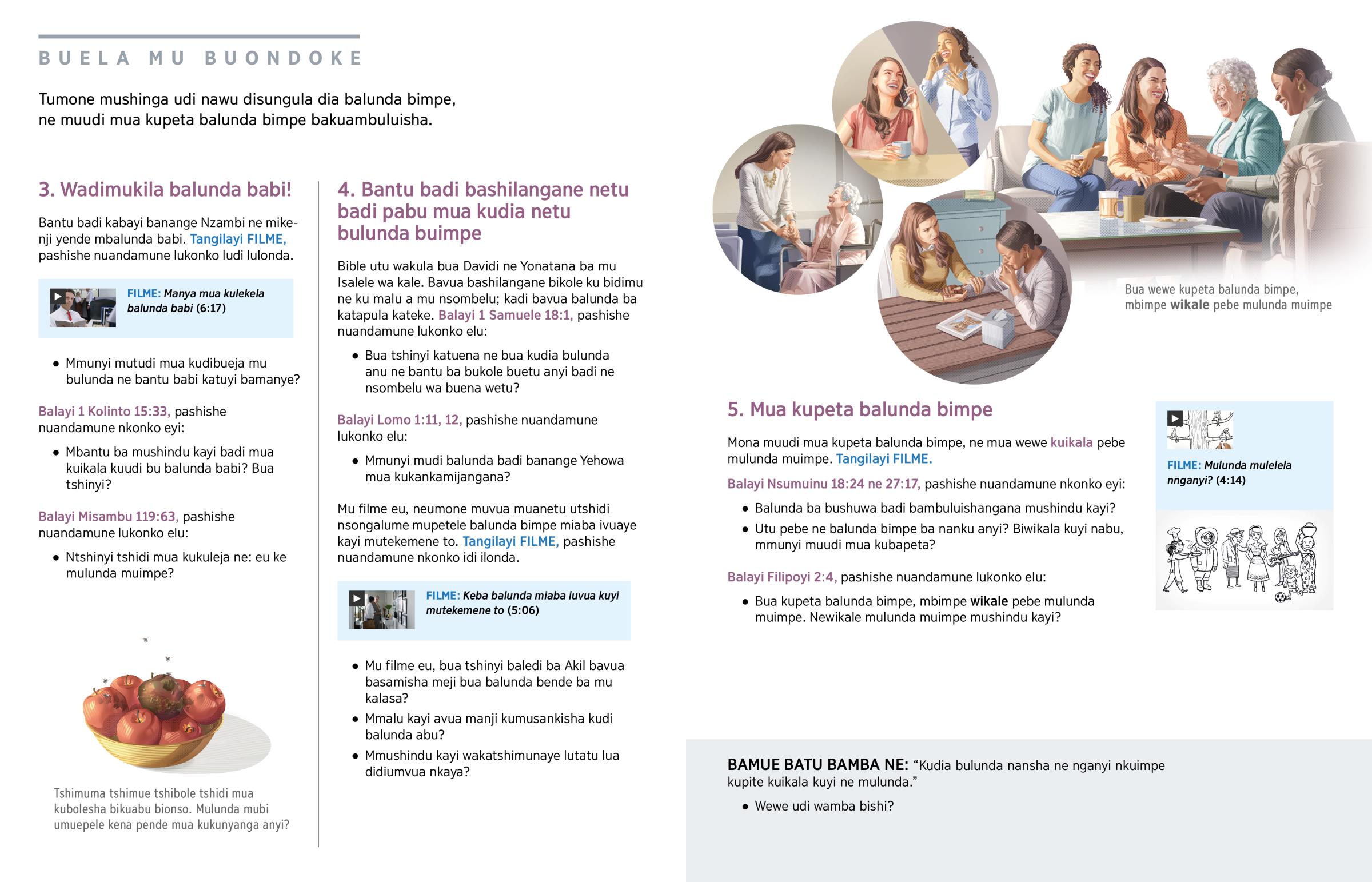 Tutu anu ne lungenyi lua kufuanangana ne bantu batudi tusomba nabu, nansha mu buimpe anyi mu bubi. Bitu nanku nansha patudi tupitshisha nabu dîba pamue mpala ne mpala anyi ku Enternete. Anu mudi Bible wamba, “udi wenda ne bena meji nealue muena meji, kadi muntu udi ubuelakana ne bantu batatakane [badi kabayi banange Yehowa] neakenge.” (Nsumuinu 13:20) Balunda badi banange Yehowa ne bamutendelela badi mua kukuambuluisha bua kushala pabuipi nende ne bua kuangata mapangadika mimpe. Kadi bulunda bukole ne badi kabayi bamutendelela budi mua kutusemeja kule nende. Ke bualu kayi Bible udi utulomba bua kusungula balunda betu ne meji! Balunda betu bobu banange Nzambi, netuambuluishangane nabu bonso. Eyowa, ‘netutungunuke ne kukankamijangana ne kukoleshangana’ nabu.—1 Tesalonike 5:11.