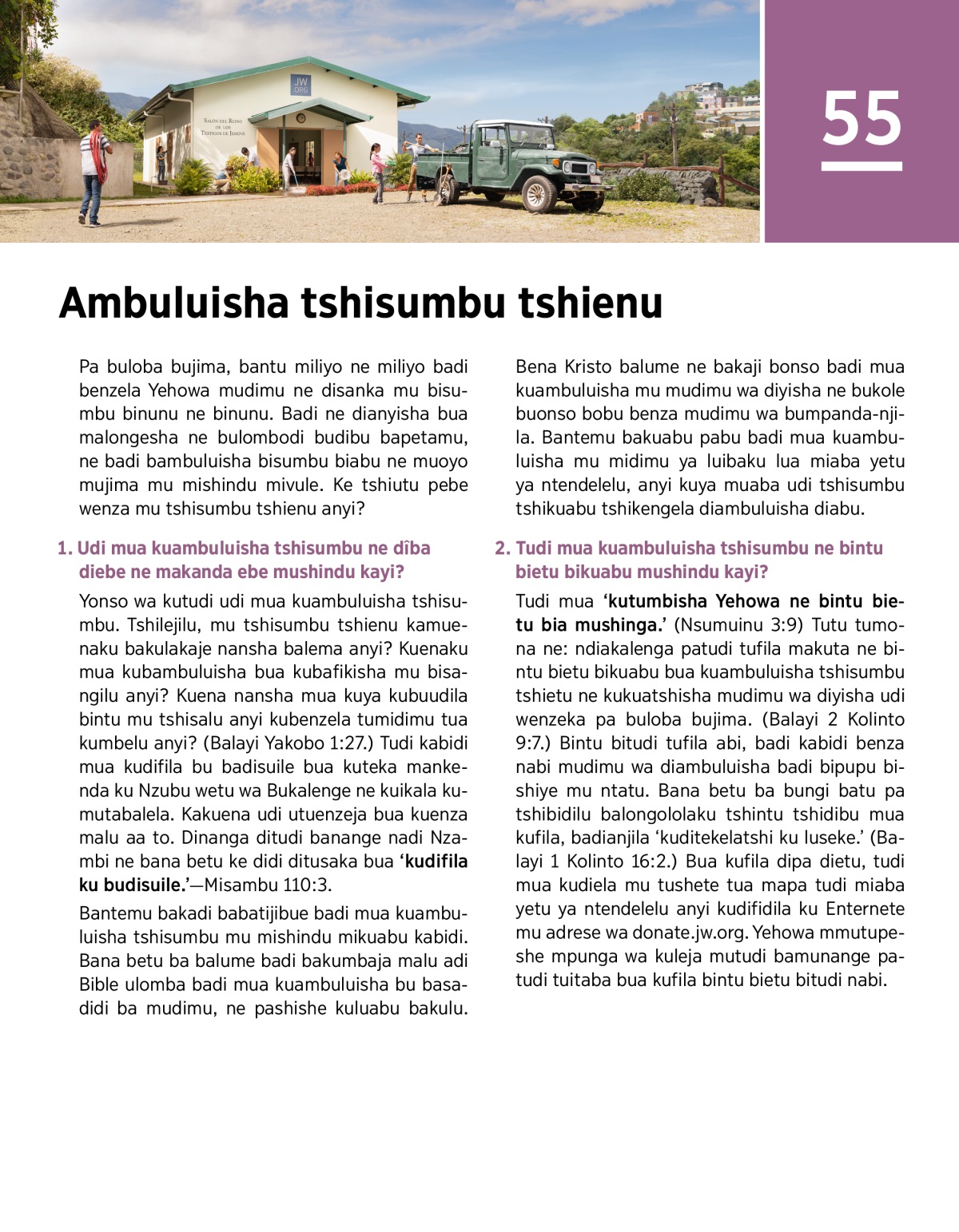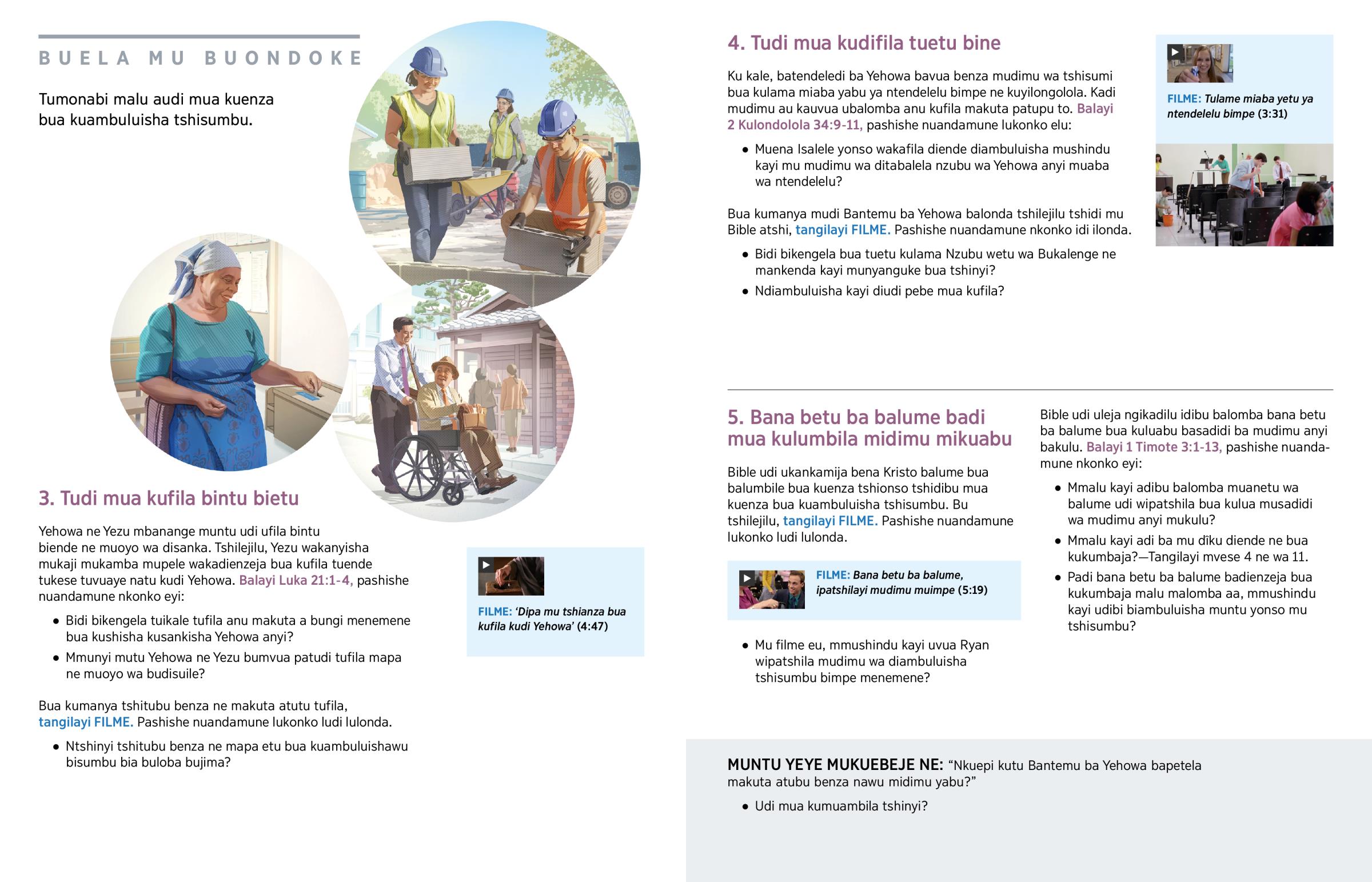 Yonso wa kutudi udi mua kuambuluisha tshisumbu. Tshilejilu, mu tshisumbu tshienu kamuenaku bakulakaje nansha balema anyi? Kuenaku mua kubambuluisha bua kubafikisha mu bisangilu anyi? Kuena nansha mua kuya kubuudila bintu mu tshisalu anyi kubenzela tumidimu tua kumbelu anyi? (Balayi Yakobo 1:27.) Tudi kabidi mua kudifila bu badisuile bua kuteka mankenda ku Nzubu wetu wa Bukalenge ne kuikala kumutabalela. Kakuena udi utuenzeja bua kuenza malu aa to. Dinanga ditudi banange nadi Nzambi ne bana betu ke didi ditusaka bua ‘kudifila ku budisuile.’—Misambu 110:3.