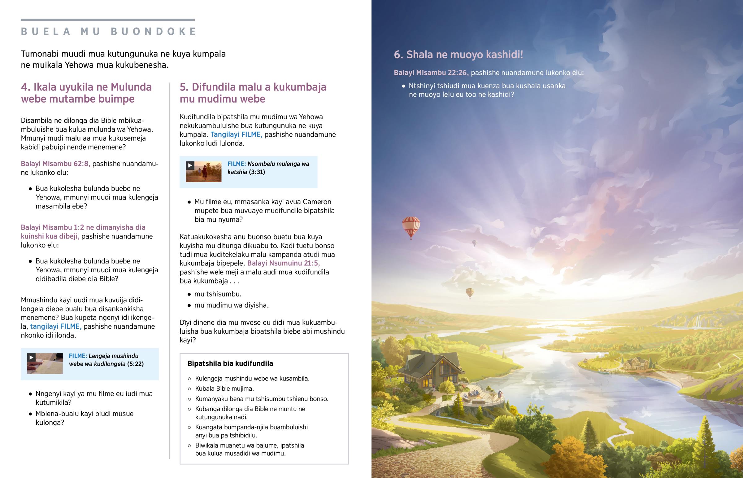 Mu programe mujima wa dilonga dia Bible eu, udi mulonge malu a Yehowa a bungi. Malu au mmakufikishe ku dimunanga bikole, pamuapa bikusake ne bua kudilambula kudiye ne kubatijibua. Pikalabi kabiyi nanku, pamuapa ntshiudi wela meji a kuenza matuku makese kumpala eku. Kadi paudi wangata batismo, kuena ulekela kuya kumpala to. Udi mua kutungunuka anu ne kusemena pabuipi ne Yehowa kashidi ne tshiendelele. Mushindu kayi?