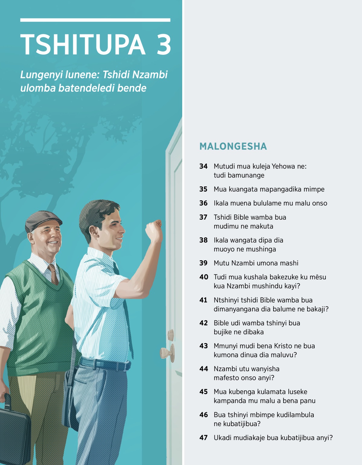 Tshitupa 3 Bia pa mabeji Lungenyi lunene: Tshidi Nzambi ulomba batendeledi bende MALONGESHA 34 Mutudi mua kuleja Yehowa ne: tudi bamunange 35 Mua kuangata mapangadika mimpe 36 Ikala muena bululame mu malu onso 37 Tshidi Bible wamba bua mudimu ne makuta 38 Ikala wangata dipa dia muoyo ne mushinga 39 Mutu Nzambi umona mashi 40 Tudi mua kushala bakezuke ku mêsu kua Nzambi mushindu kayi? 41 Ntshinyi tshidi Bible wamba bua dimanyangana dia balume ne bakaji? 42 Bible udi wamba tshinyi bua bujike ne dibaka? 43 Mmunyi mudi bena Kristo ne bua kumona dinua dia maluvu? 44 Nzambi utu wanyisha mafesto onso anyi? 45 Mua kubenga kulamata luseke kampanda mu malu a bena panu 46 Bua tshinyi mbimpe kudilambula ne kubatijibua? 47 Ukadi mudiakaje bua kubatijibua anyi?