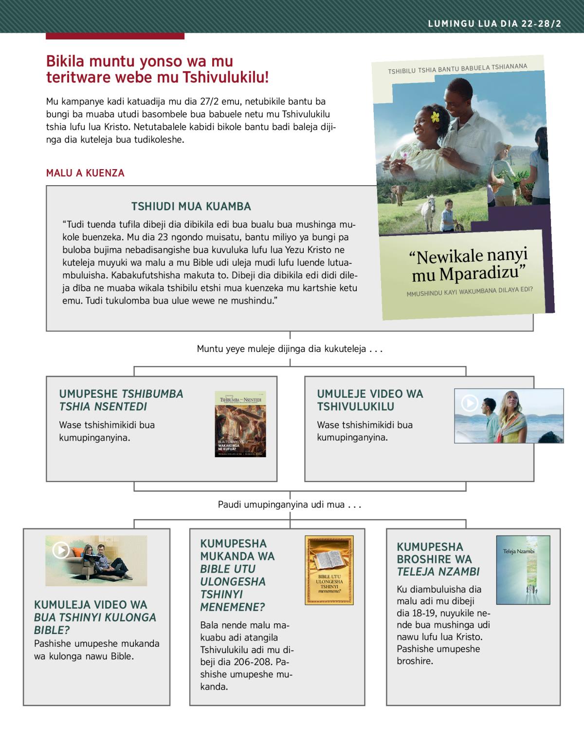 “Tudi tuenda tufila dibeji dia dibikila edi bua bualu bua mushinga mukole buenzeka. Mu dia 23 ngondo muisatu, bantu miliyo ya bungi pa buloba bujima nebadisangishe bua kuvuluka lufu lua Yezu Kristo ne kuteleja muyuki wa malu a mu Bible udi uleja mudi lufu luende lutuambuluisha. Kabakufutshisha makuta to. Dibeji dia dibikila edi didi dileja dîba ne muaba wikala tshibilu etshi mua kuenzeka mu kartshie ketu emu. Tudi tukulomba bua ulue wewe ne mushindu.”