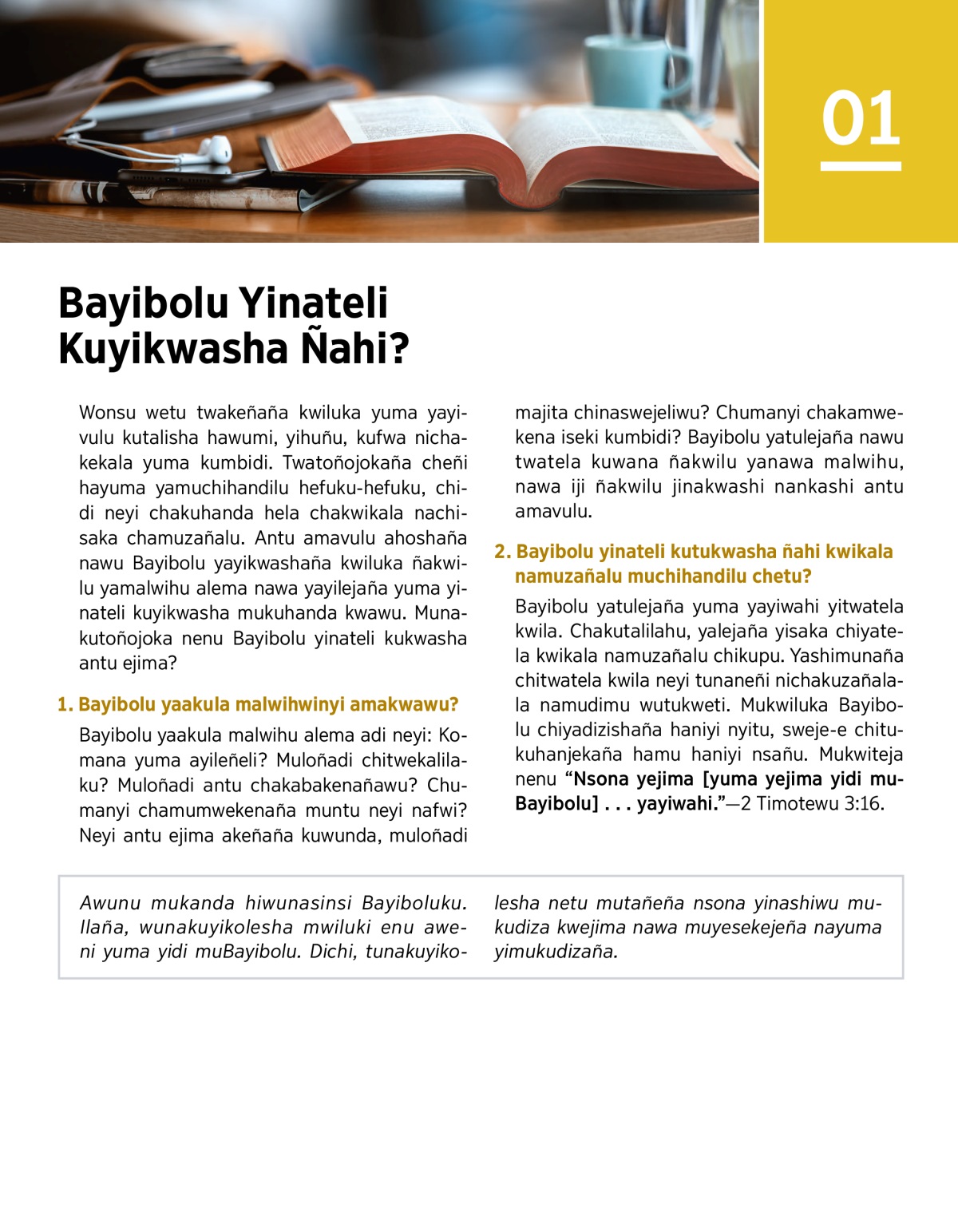 Awunu mukanda hiwunasinsi Bayiboluku. Ilaña, wunakuyikolesha mwiluki enu aweni yuma yidi muBayibolu. Dichi, tunakuyikolesha netu mutañeña nsona yinashiwu mukudiza kwejima nawa muyesekejeña nayuma yimukudizaña.