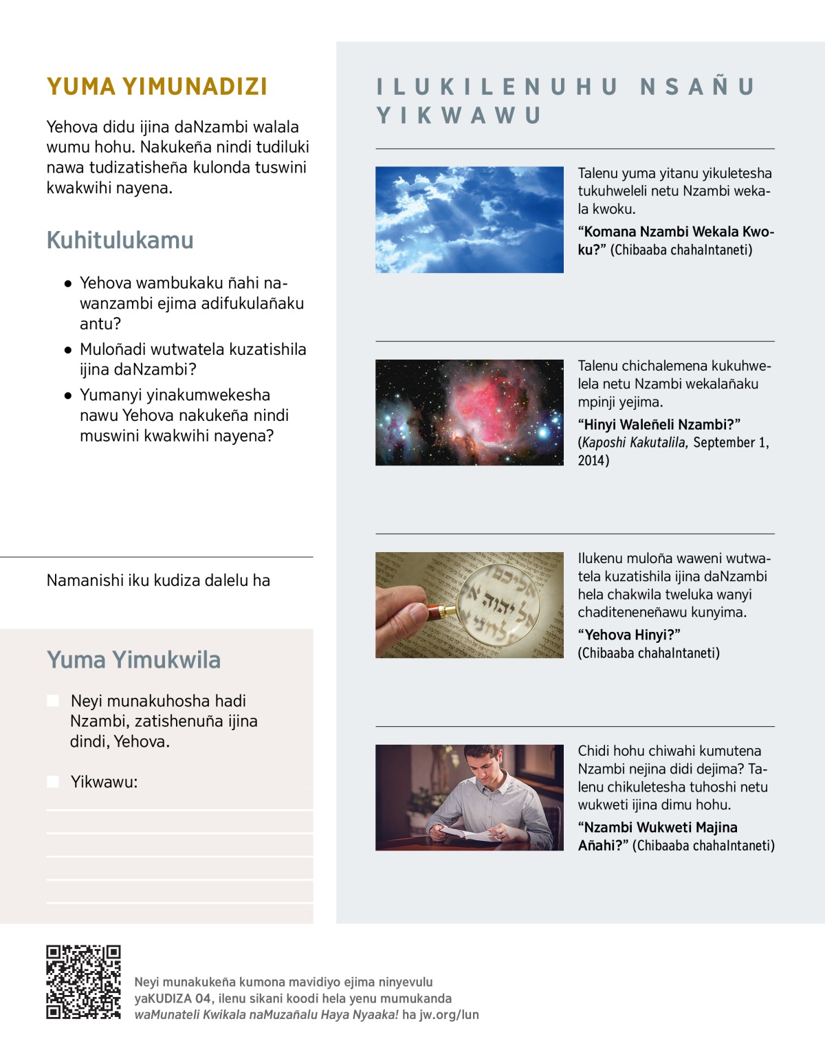Ilukenu muloña waweni wutwatela kuzatishila ijina daNzambi hela chakwila tweluka wanyi chaditeneneñawu kunyima.