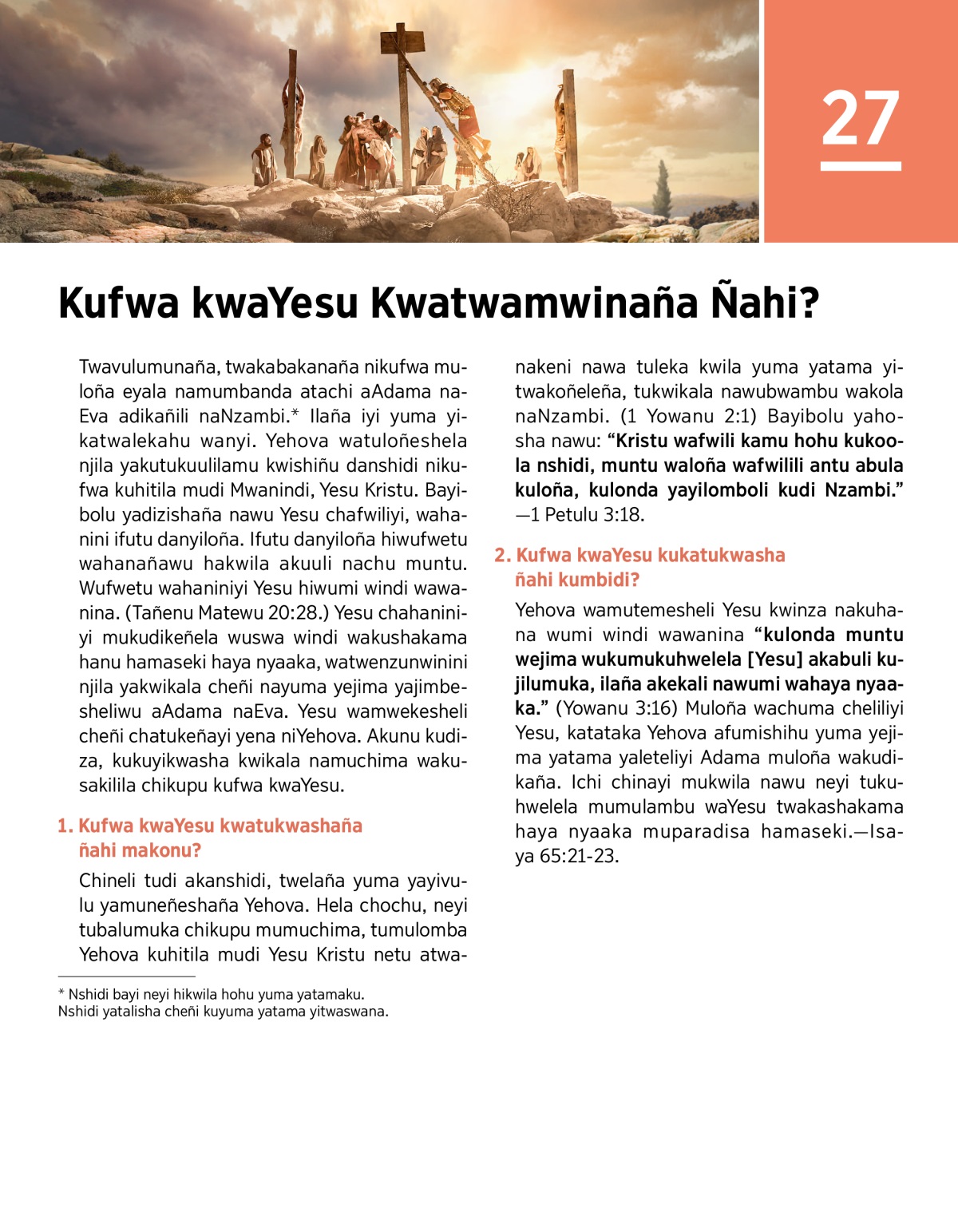 Twavulumunaña, twakabakanaña nikufwa muloña eyala namumbanda atachi aAdama naEva adikañili naNzambi.a Ilaña iyi yuma yikatwalekahu wanyi. Yehova watuloñeshela njila yakutukuulilamu kwishiñu danshidi nikufwa kuhitila mudi Mwanindi, Yesu Kristu. Bayibolu yadizishaña nawu Yesu chafwiliyi, wahanini ifutu danyiloña. Ifutu danyiloña hiwufwetu wahanañawu hakwila akuuli nachu muntu. Wufwetu wahaniniyi Yesu hiwumi windi wawanina. (Tañenu Matewu 20:28.) Yesu chahaniniyi mukudikeñela wuswa windi wakushakama hanu hamaseki haya nyaaka, watwenzunwinini njila yakwikala cheñi nayuma yejima yajimbesheliwu aAdama naEva. Yesu wamwekesheli cheñi chatukeñayi yena niYehova. Akunu kudiza, kukuyikwasha kwikala namuchima wakusakilila chikupu kufwa kwaYesu.