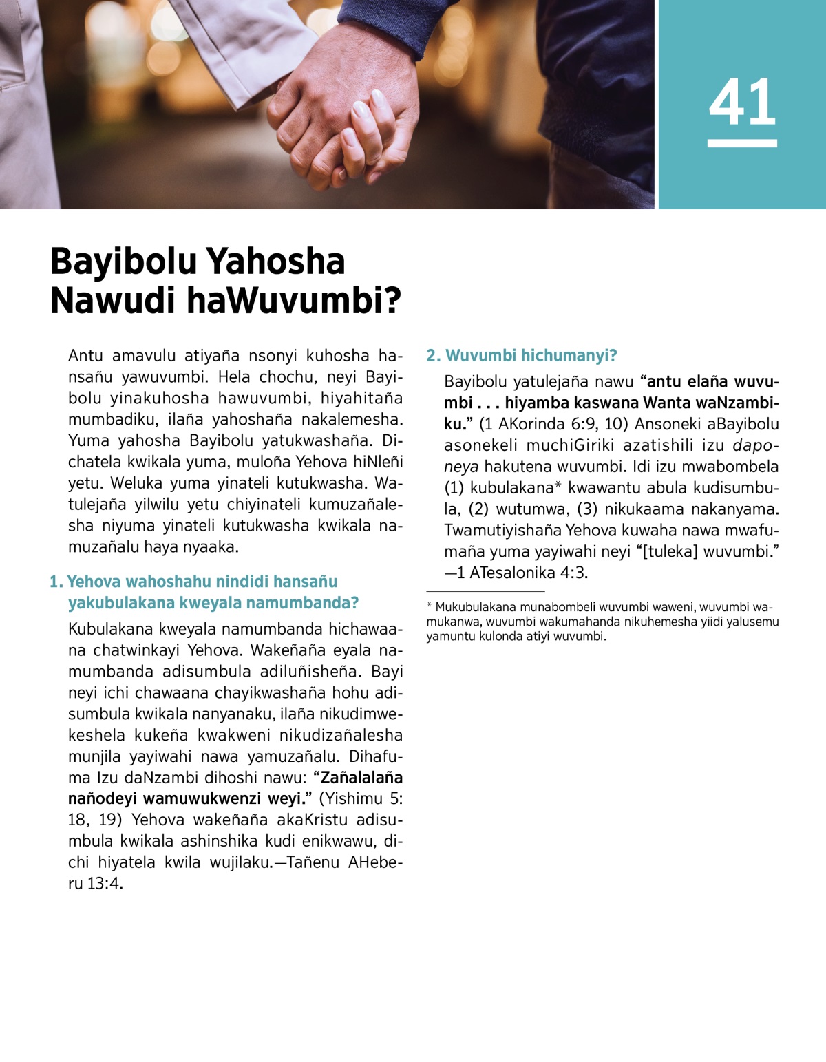 Bayibolu yatulejaña nawu “antu elaña wuvumbi . . . hiyamba kaswana Wanta waNzambiku.” (1 AKorinda 6:9, 10) Ansoneki aBayibolu asonekeli muchiGiriki azatishili izu daponeya hakutena wuvumbi. Idi izu mwabombela (1) kubulakanaa kwawantu abula kudisumbula, (2) wutumwa, (3) nikukaama nakanyama. Twamutiyishaña Yehova kuwaha nawa mwafumaña yuma yayiwahi neyi “[tuleka] wuvumbi.”—1 ATesalonika 4:3.