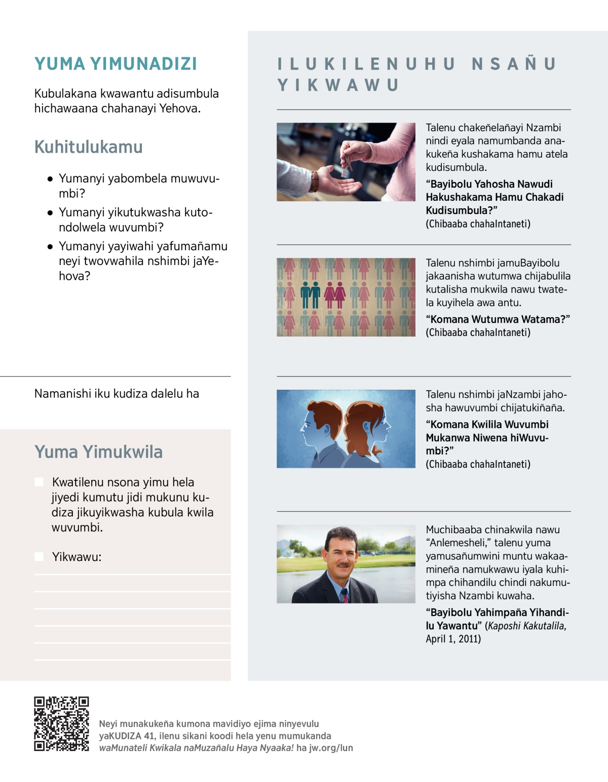Antu amavulu atiyaña nsonyi kuhosha hansañu yawuvumbi. Hela chochu, neyi Bayibolu yinakuhosha hawuvumbi, hiyahitaña mumbadiku, ilaña yahoshaña nakalemesha. Yuma yahosha Bayibolu yatukwashaña. Dichatela kwikala yuma, muloña Yehova hiNleñi yetu. Weluka yuma yinateli kutukwasha. Watulejaña yilwilu yetu chiyinateli kumuzañalesha niyuma yinateli kutukwasha kwikala namuzañalu haya nyaaka.