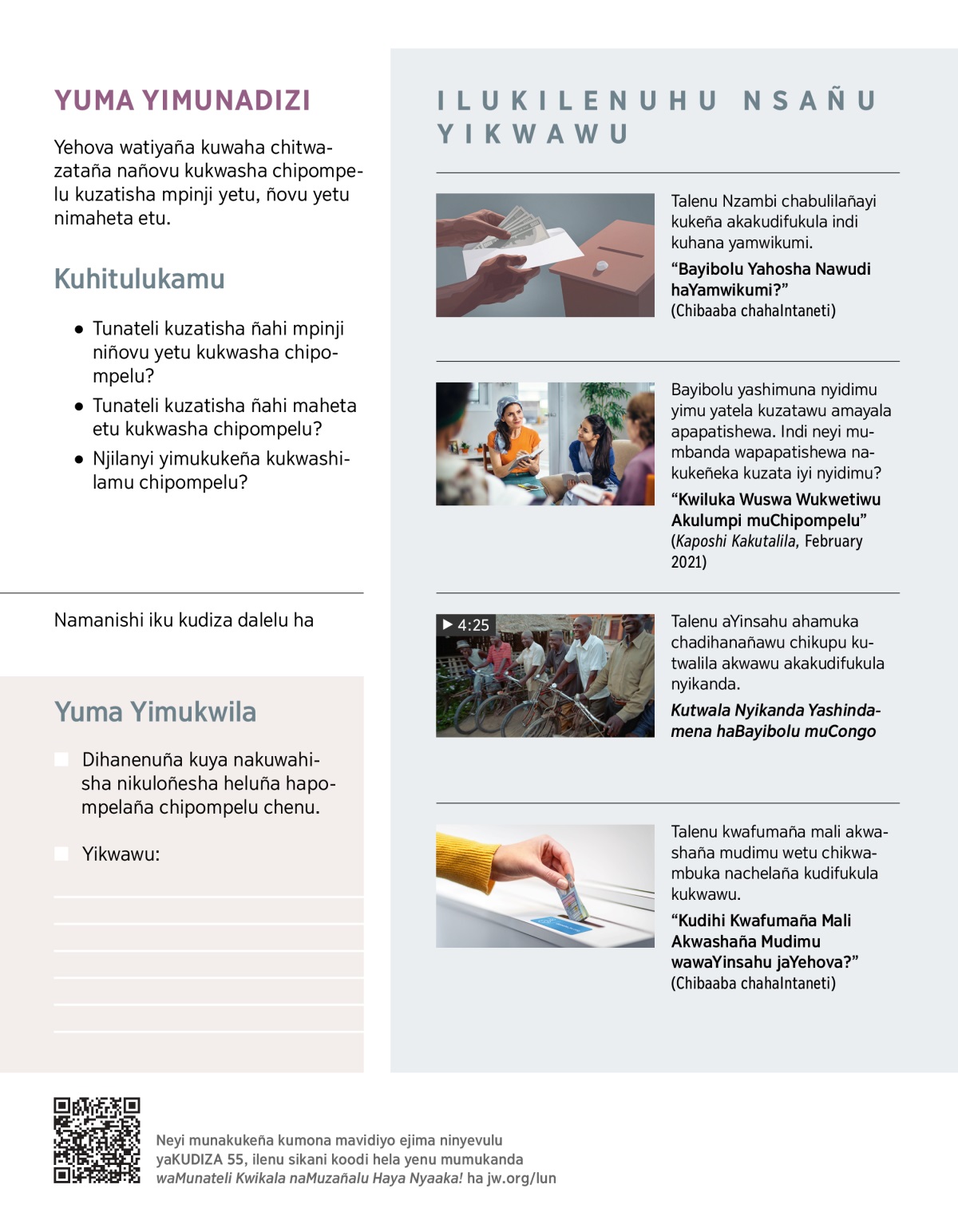 Tunateli “[kumulemesha] Yehova nayuma [yetu] yalema.” (Yishimu 3:9) Twatiyaña kuwaha kuhana mali niyuma yitukweti hakwila tukwashi chipompelu chetu nimudimu wakushimwina mukaayi kejima. (Tañenu 2 AKorinda 9:7.) Yawaana yetu ayizatishaña cheñi kukwasha adi muwubanji wadimwekenaña. Amavulu “[ahembañaku] yawaana hambadi” kulonda ahaneña yawaana mpinji yejima. (Tañenu 1 AKorinda 16:2.) Tunateli kuhana yawaana kuzatisha yikasha yekala mumaluña etu akudifukwila hela haIntaneti hanasonekiwu nawu hanenu yawaana ha jw.org. Yehova watwinka kukooleka kwakumwekesha chitwamukeña nanochu chitwazatishaña maheta etu.
