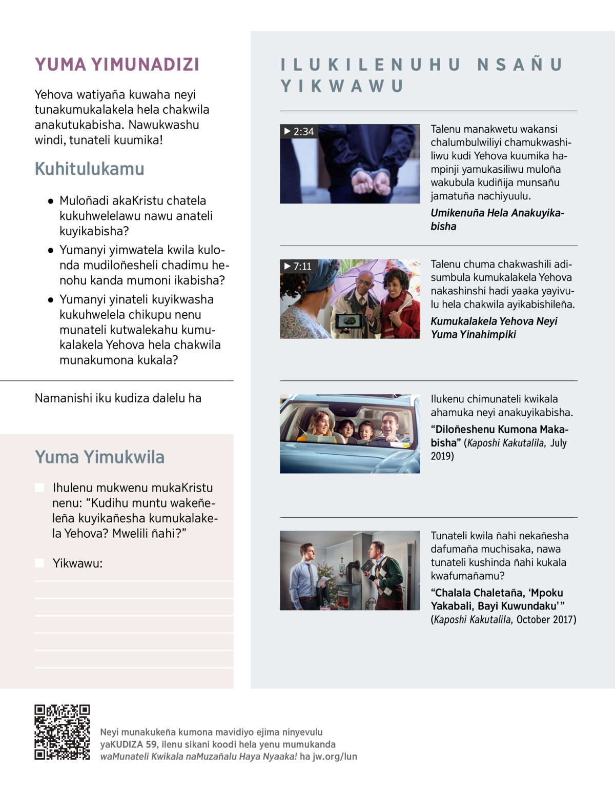 AYinsahu jaYehova akweti yaaka ninkulilu yashiyashana, anatwalekihu kumukalakela Yehova nakashinshi hela chakwila anakuyikabisha. Hakwila mwiluki chayikwashili, vumishenu VIDIYO. Kuhiñahu hanjekenu halwihu lunalondelihu.
