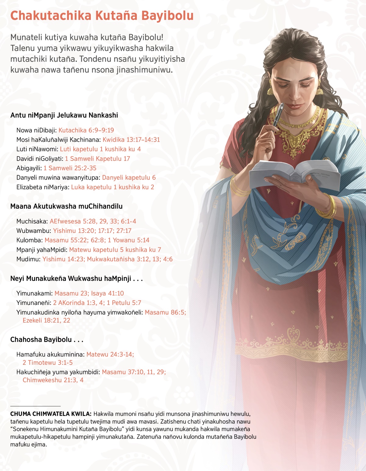 CHUMA CHIMWATELA KWILA: Hakwila mumoni nsañu yidi munsona jinashimuniwu hewulu, tañenu kapetulu hela tupetulu twejima mudi awa mavasi. Zatishenu chati yinakuhosha nawu “Sonekenu Himunakumini Kutaña Bayibolu” yidi kunsa yawunu mukanda hakwila mumakeña mukapetulu-hikapetulu hampinji yimunakutaña. Zatenuña nañovu kulonda mutañeña Bayibolu mafuku ejima.