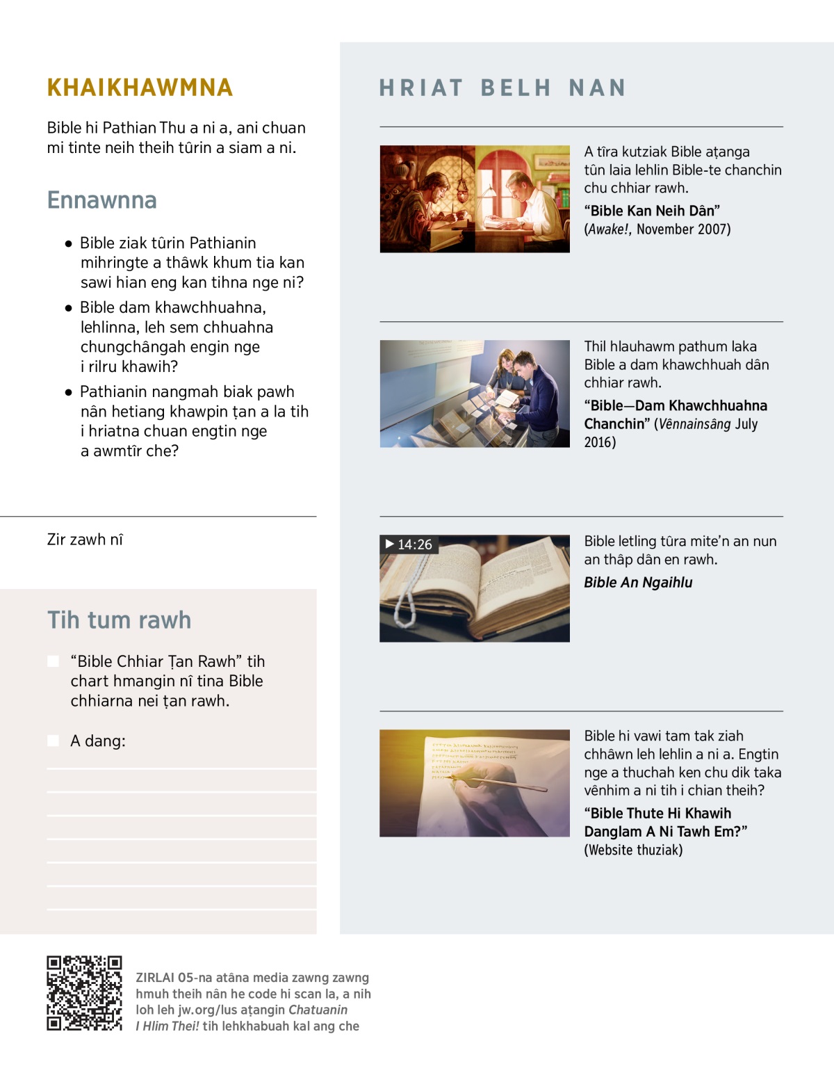 “Hnam tinrêng te, chi tinrêng te, ṭawng tinrêng te, mi tinrêng te” chuan Bible-a chuang chanchin ṭha chu an hlâwkpui thei a ni. (Thu Puan 14:6 chhiar rawh.) Pathian chuan Bible hi mihring chanchina lehkha bu dang zawng zawng aiin ṭawng tam zâwka neih theih tûrin a siam a. Tûn laiah, eng ṭawng pawh hmangin khawi hmunah pawh awm ila, mi tin deuhthaw hian mahni ṭawngin Bible kan chhiarin kan hlâwkpui thei tawh a ni.