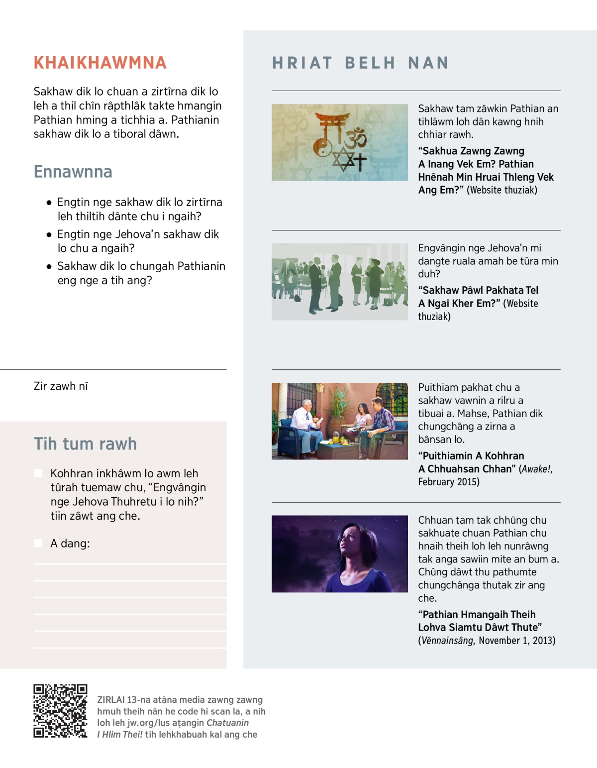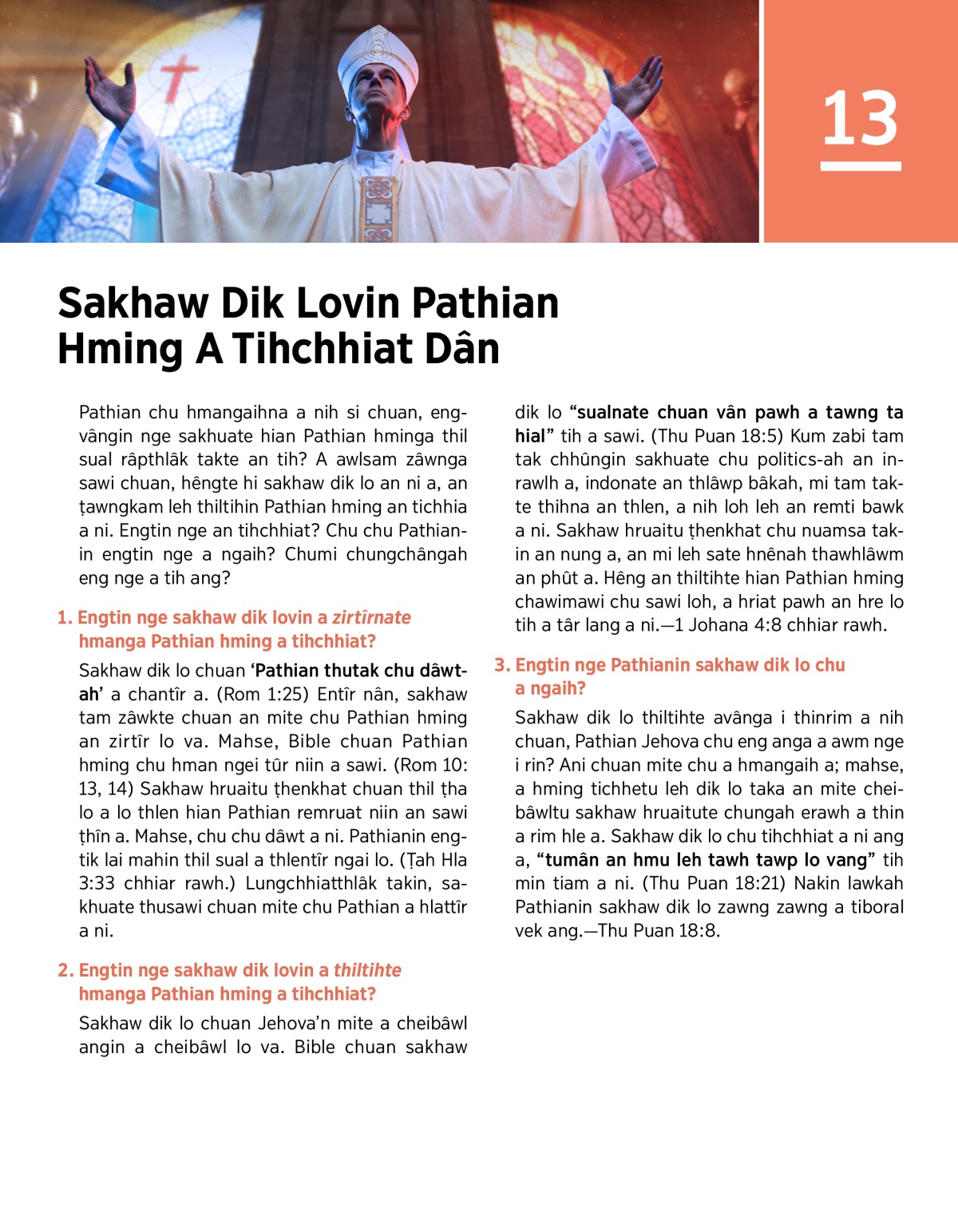 Sakhaw dik lo chuan ‘Pathian thutak chu dâwtah’ a chantîr a. (Rom 1:25) Entîr nân, sakhaw tam zâwkte chuan an mite chu Pathian hming an zirtîr lo va. Mahse, Bible chuan Pathian hming chu hman ngei tûr niin a sawi. (Rom 10:13, 14) Sakhaw hruaitu ṭhenkhat chuan thil ṭha lo a lo thlen hian Pathian remruat niin an sawi ṭhîn a. Mahse, chu chu dâwt a ni. Pathianin engtik lai mahin thil sual a thlentîr ngai lo. (Ṭah Hla 3:33 chhiar rawh.) Lungchhiatthlâk takin, sakhuate thusawi chuan mite chu Pathian a hlattîr a ni.