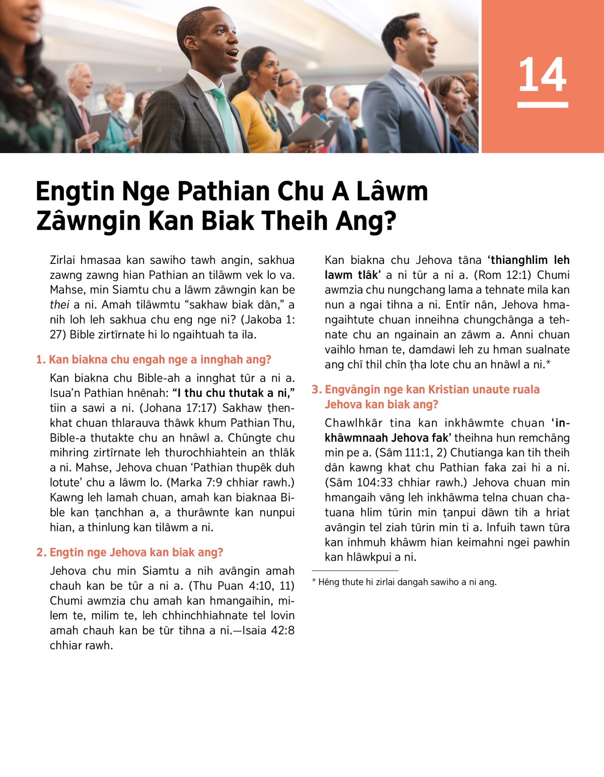 Zirlai hmasaa kan sawiho tawh angin, sakhua zawng zawng hian Pathian an tilâwm vek lo va. Mahse, min Siamtu chu a lâwm zâwngin kan be thei a ni. Amah tilâwmtu “sakhaw biak dân,” a nih loh leh sakhua chu eng nge ni? (Jakoba 1:27) Bible zirtîrnate hi lo ngaihtuah ta ila.
