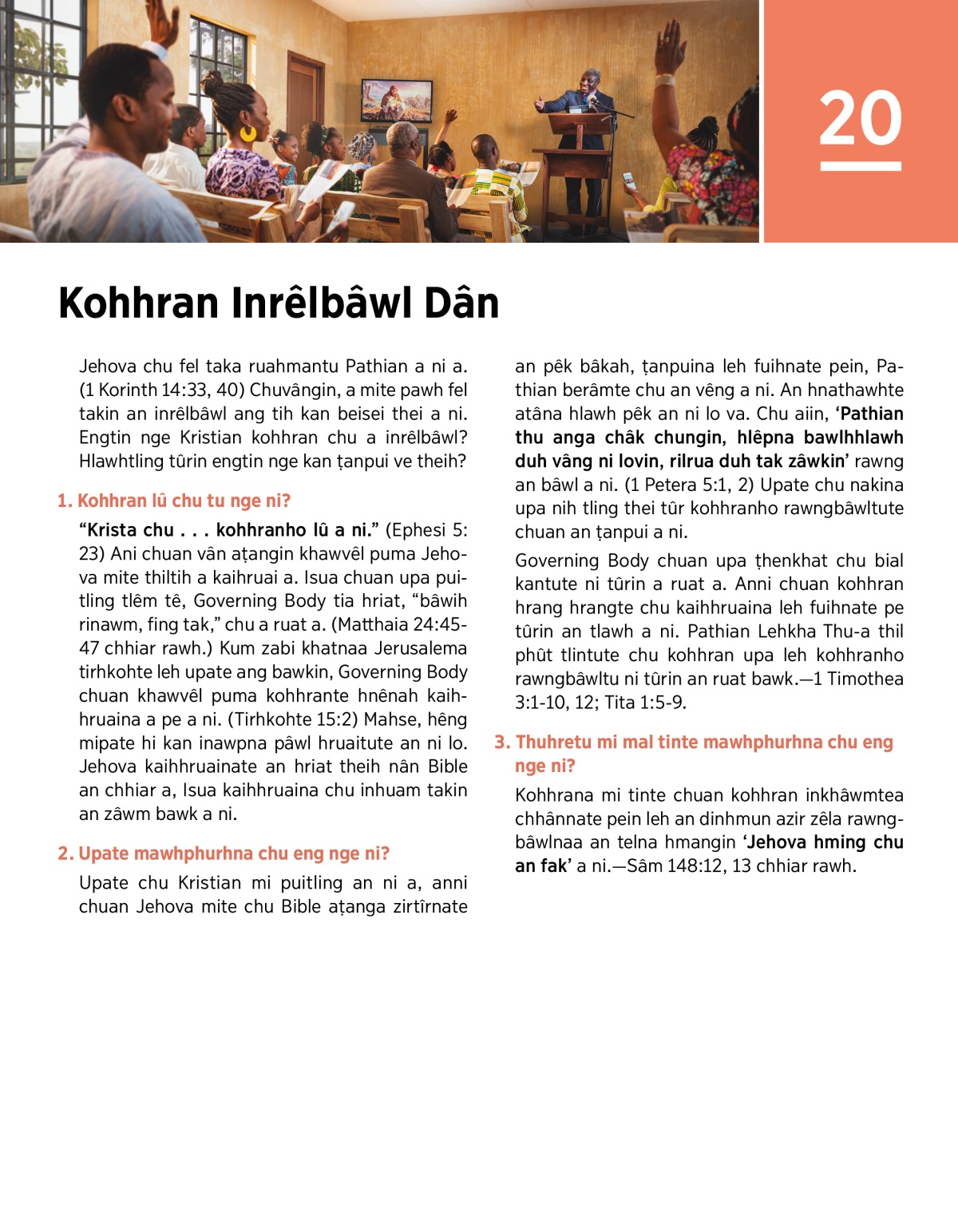 “Krista chu . . . kohhranho lû a ni.” (Ephesi 5:23) Ani chuan vân aṭangin khawvêl puma Jehova mite thiltih a kaihruai a. Isua chuan upa puitling tlêm tê, Governing Body tia hriat, “bâwih rinawm, fing tak,” chu a ruat a. (Matthaia 24:45-47 chhiar rawh.) Kum zabi khatnaa Jerusalema tirhkohte leh upate ang bawkin, Governing Body chuan khawvêl puma kohhrante hnênah kaihhruaina a pe a ni. (Tirhkohte 15:2) Mahse, hêng mipate hi kan inawpna pâwl hruaitute an ni lo. Jehova kaihhruainate an hriat theih nân Bible an chhiar a, Isua kaihhruaina chu inhuam takin an zâwm bawk a ni.