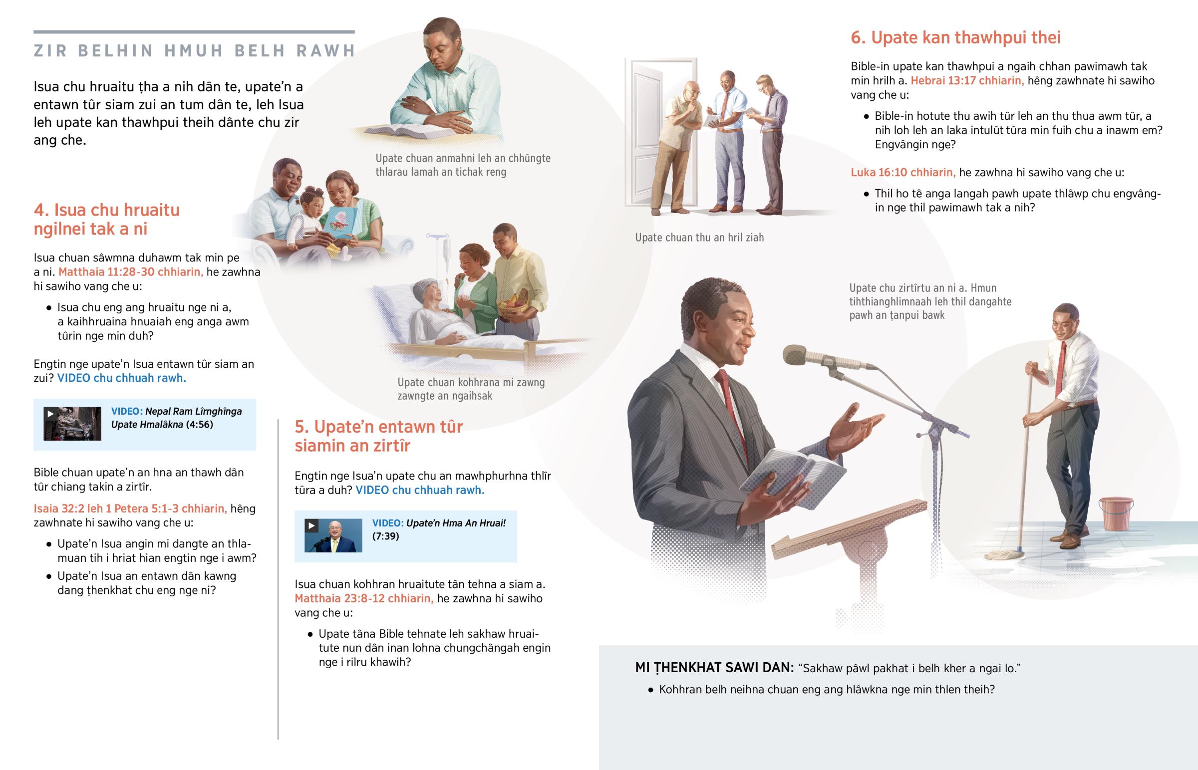 Upate chu Kristian mi puitling an ni a, anni chuan Jehova mite chu Bible aṭanga zirtîrnate an pêk bâkah, ṭanpuina leh fuihnate pein, Pathian berâmte chu an vêng a ni. An hnathawhte atâna hlawh pêk an ni lo va. Chu aiin, ‘Pathian thu anga châk chungin, hlêpna bawlhhlawh duh vâng ni lovin, rilrua duh tak zâwkin’ rawng an bâwl a ni. (1 Petera 5:1, 2) Upate chu nakina upa nih tling thei tûr kohhranho rawngbâwltute chuan an ṭanpui a ni.
