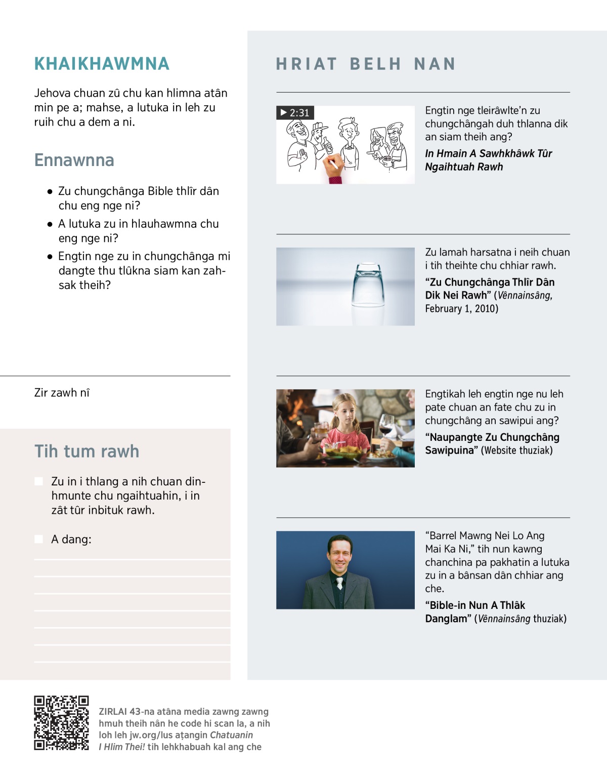 Rom 13:13 leh 1 Korinth 10:31, 32 chhiar rawh. Bible châng târ lan pakhat in chhiar zawh apiangin, he zawhna hi sawiho vang che u: