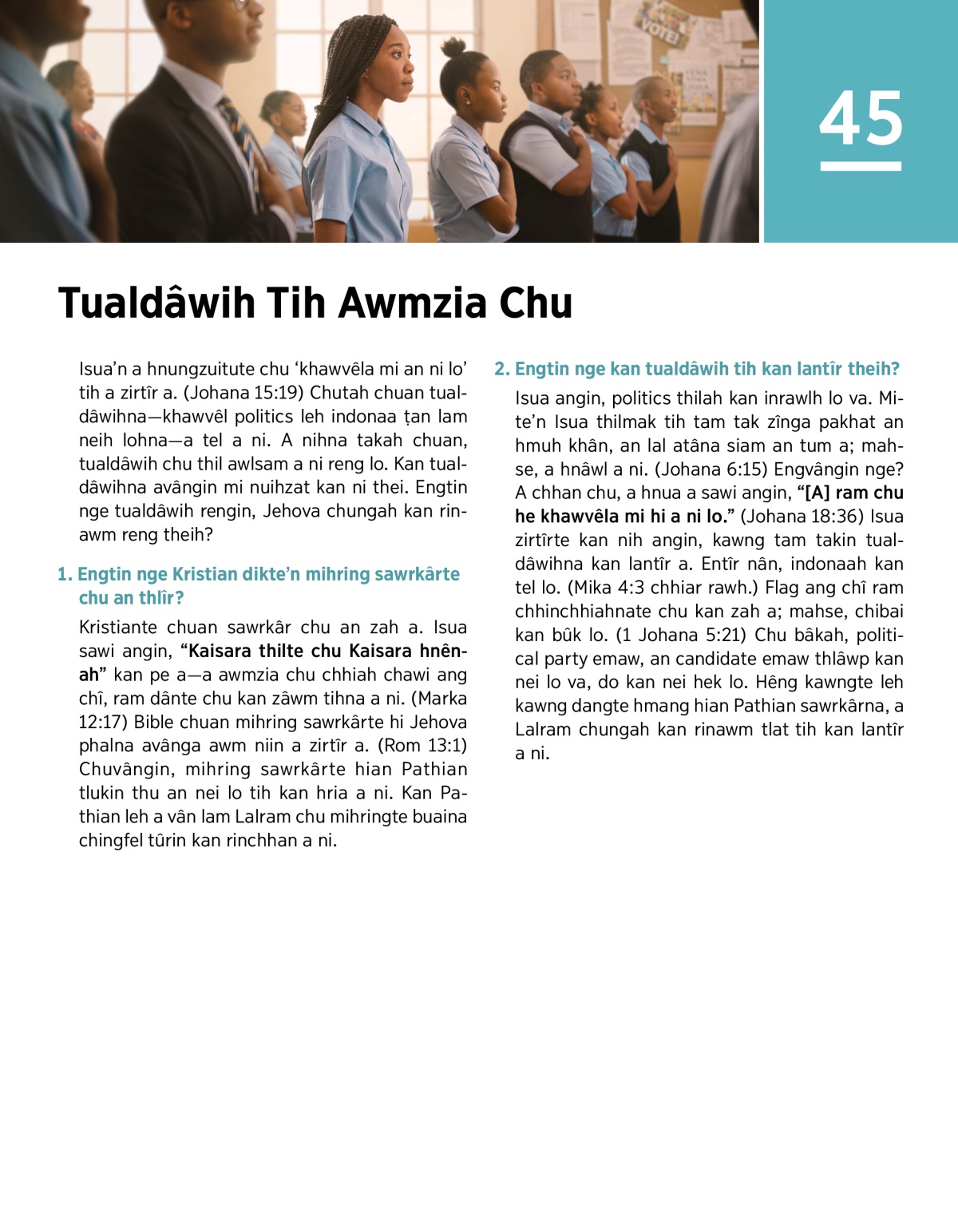 Isua’n a hnungzuitute chu ‘khawvêla mi an ni lo’ tih a zirtîr a. (Johana 15:19) Chutah chuan tualdâwihna—khawvêl politics leh indonaa ṭan lam neih lohna—a tel a ni. A nihna takah chuan, tualdâwih chu thil awlsam a ni reng lo. Kan tualdâwihna avângin mi nuihzat kan ni thei. Engtin nge tualdâwih rengin, Jehova chungah kan rinawm reng theih?