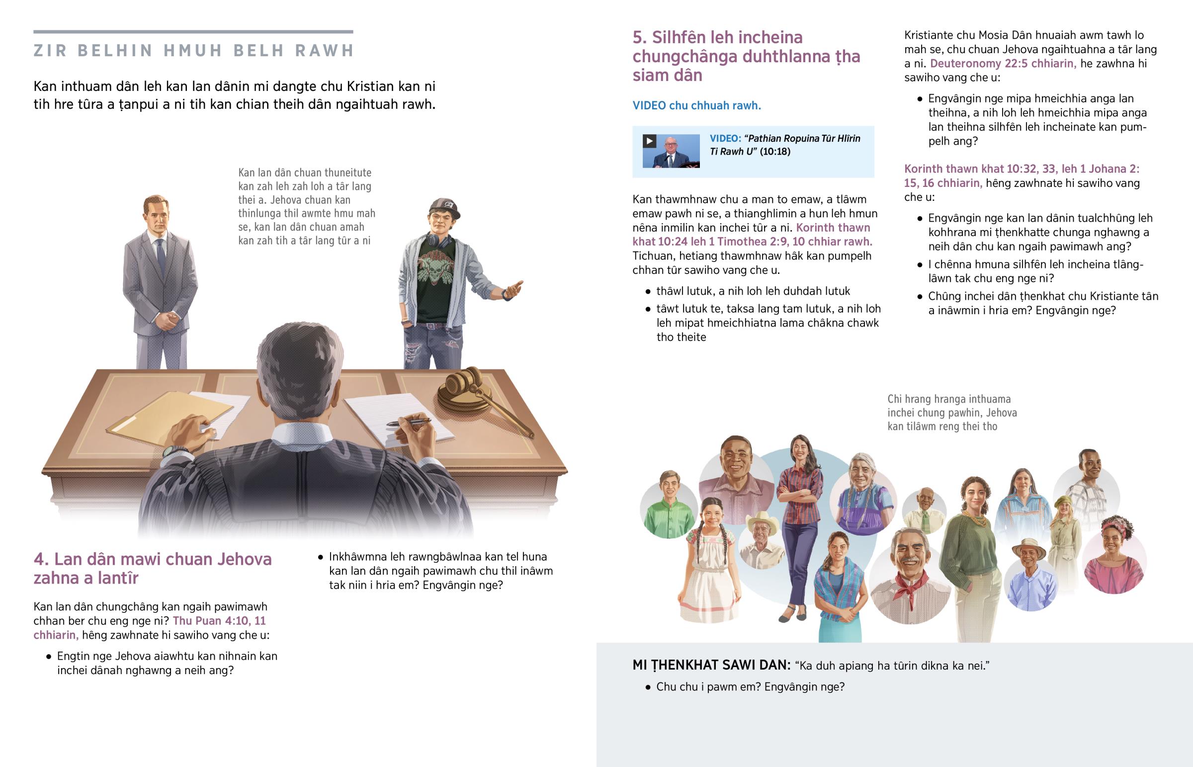 Kan za hian kan inthuam dân tûr leh kan inchei dân tûrah duh dân kan nei ṭheuh va. Bible thu bul tluang tak ṭhenkhat kan zâwm a nih chuan, kan mi mal duh zâwng chauh ni lovin Jehova tilâwmtu kan thlang thei ang. Chûng thu bul ṭhenkhat chu i lo ngaihtuah ang u.
