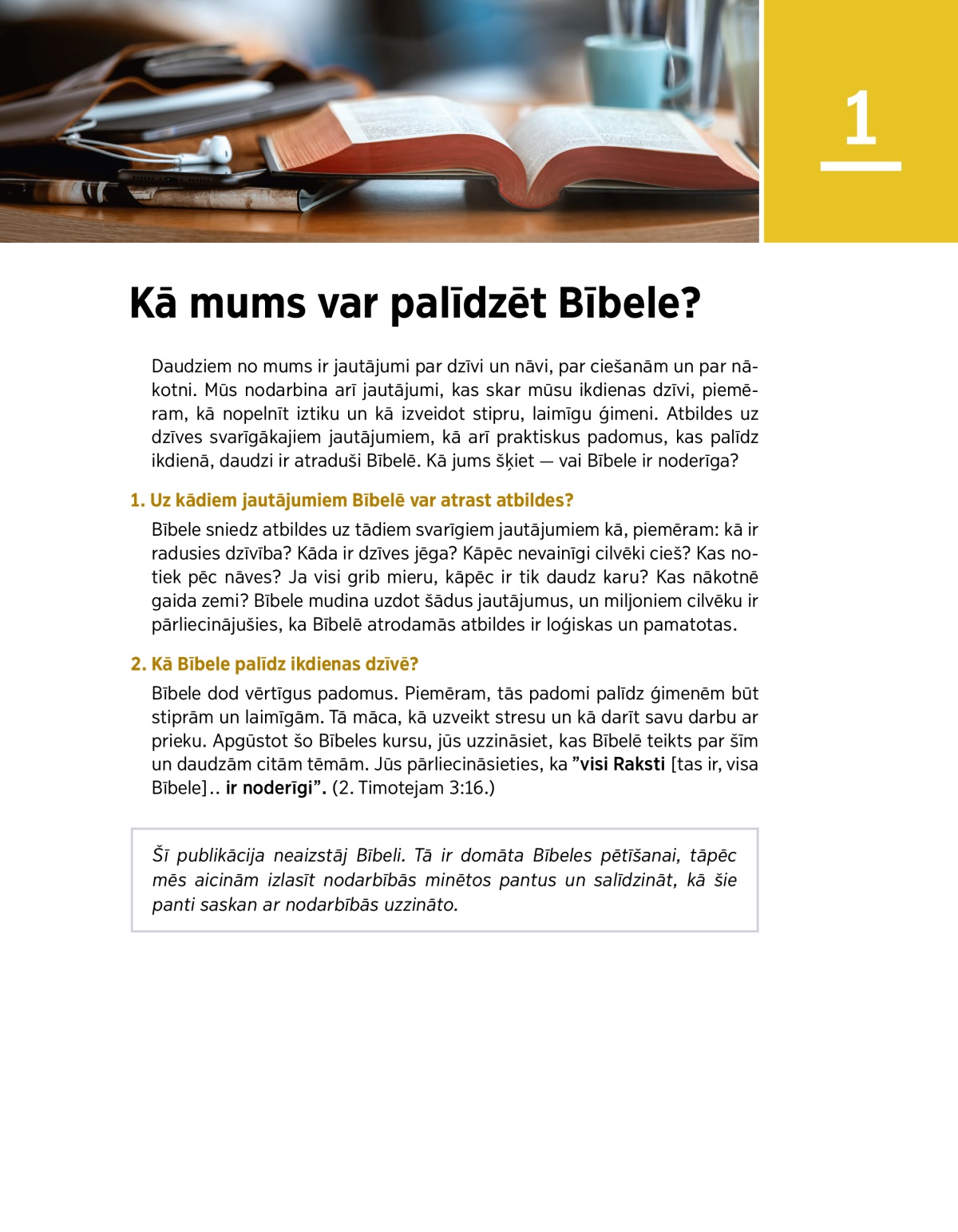 Šī publikācija neaizstāj Bībeli. Tā ir domāta Bībeles pētīšanai, tāpēc mēs aicinām izlasīt nodarbībās minētos pantus un salīdzināt, kā šie panti saskan ar nodarbībās uzzināto.