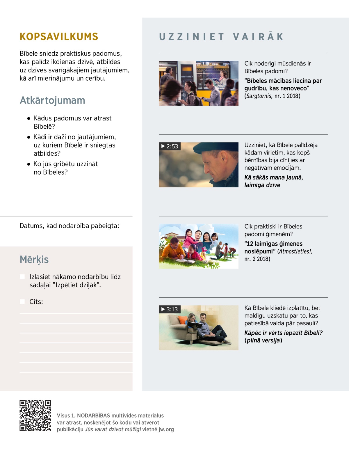 Bībele dod vērtīgus padomus. Piemēram, tās padomi palīdz ģimenēm būt stiprām un laimīgām. Tā māca, kā uzveikt stresu un kā darīt savu darbu ar prieku. Apgūstot šo Bībeles kursu, jūs uzzināsiet, kas Bībelē teikts par šīm un daudzām citām tēmām. Jūs pārliecināsieties, ka ”visi Raksti [tas ir, visa Bībele].. ir noderīgi”. (2. Timotejam 3:16.)