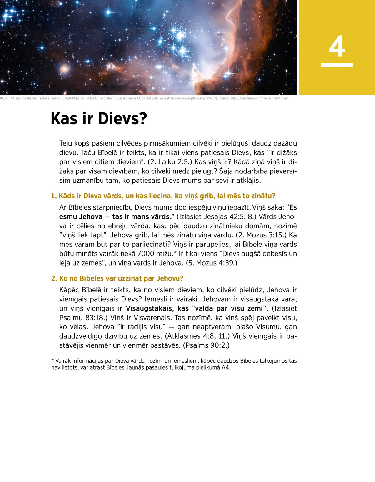 a Vairāk informācijas par Dieva vārda nozīmi un iemesliem, kāpēc daudzos Bībeles tulkojumos tas nav lietots, var atrast Bībeles Jaunās pasaules tulkojuma pielikumā A4.