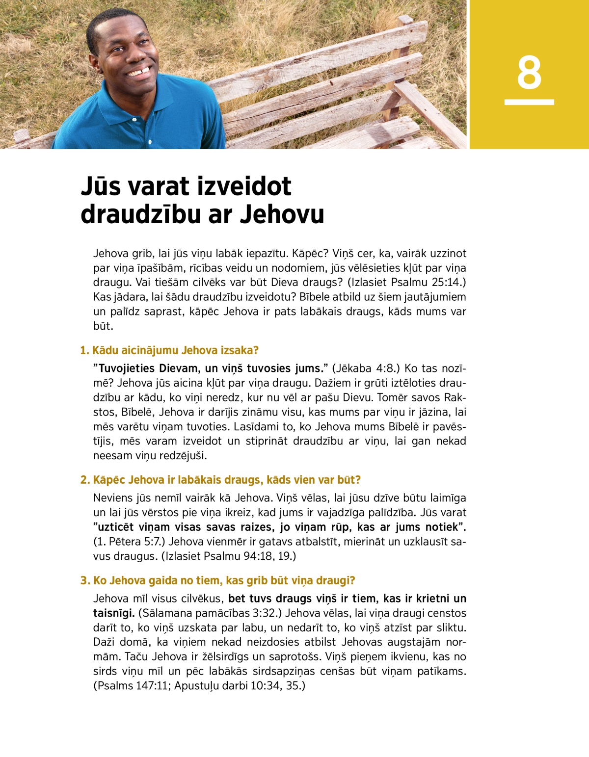 ”Tuvojieties Dievam, un viņš tuvosies jums.” (Jēkaba 4:8.) Ko tas nozīmē? Jehova jūs aicina kļūt par viņa draugu. Dažiem ir grūti iztēloties draudzību ar kādu, ko viņi neredz, kur nu vēl ar pašu Dievu. Tomēr savos Rakstos, Bībelē, Jehova ir darījis zināmu visu, kas mums par viņu ir jāzina, lai mēs varētu viņam tuvoties. Lasīdami to, ko Jehova mums Bībelē ir pavēstījis, mēs varam izveidot un stiprināt draudzību ar viņu, lai gan nekad neesam viņu redzējuši.