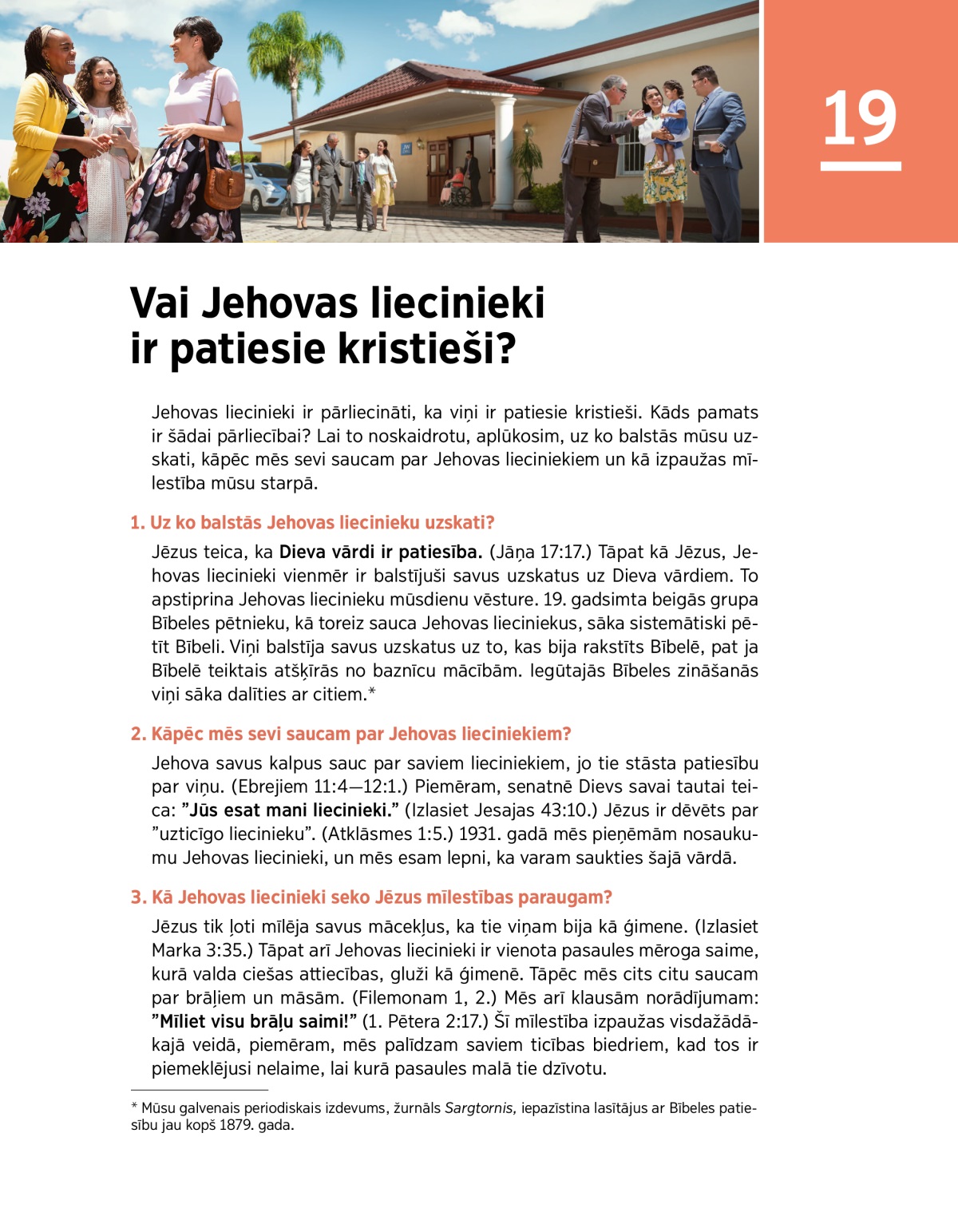 Jehovas liecinieki ir patiesie kristieši. Viņi veido vienotu pasaules mēroga brāļu saimi, balsta savus uzskatus uz Bībeli un sludina patiesību par Jehovu.