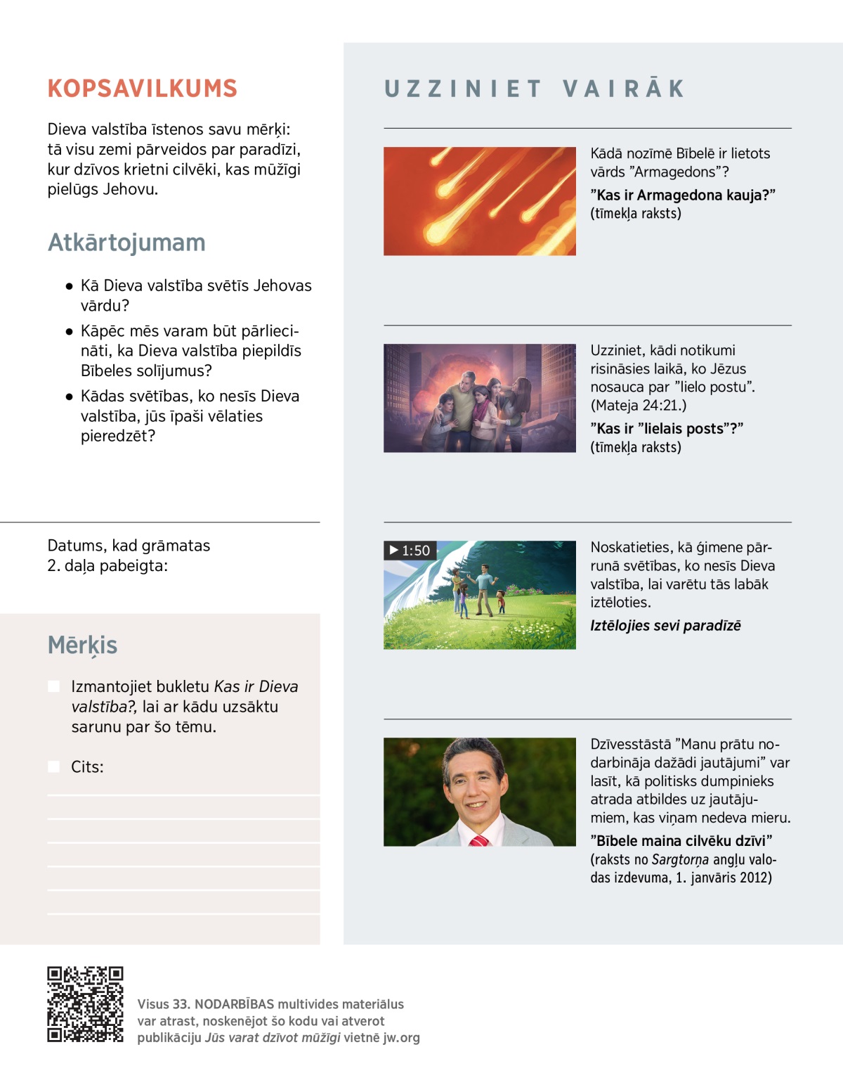 Dieva valstība īstenos savu mērķi: tā visu zemi pārveidos par paradīzi, kur dzīvos krietni cilvēki, kas mūžīgi pielūgs Jehovu.