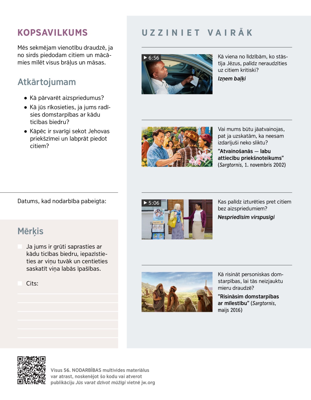 Mēs vēlamies mīlēt visus brāļus un māsas. Bet varbūt nav viegli mīlēt tos, kas, mūsuprāt, ļoti atšķiras no mums. Kas mums var palīdzēt? Izlasiet Apustuļu darbus 10:34, 35. Jautājumi pārrunām: