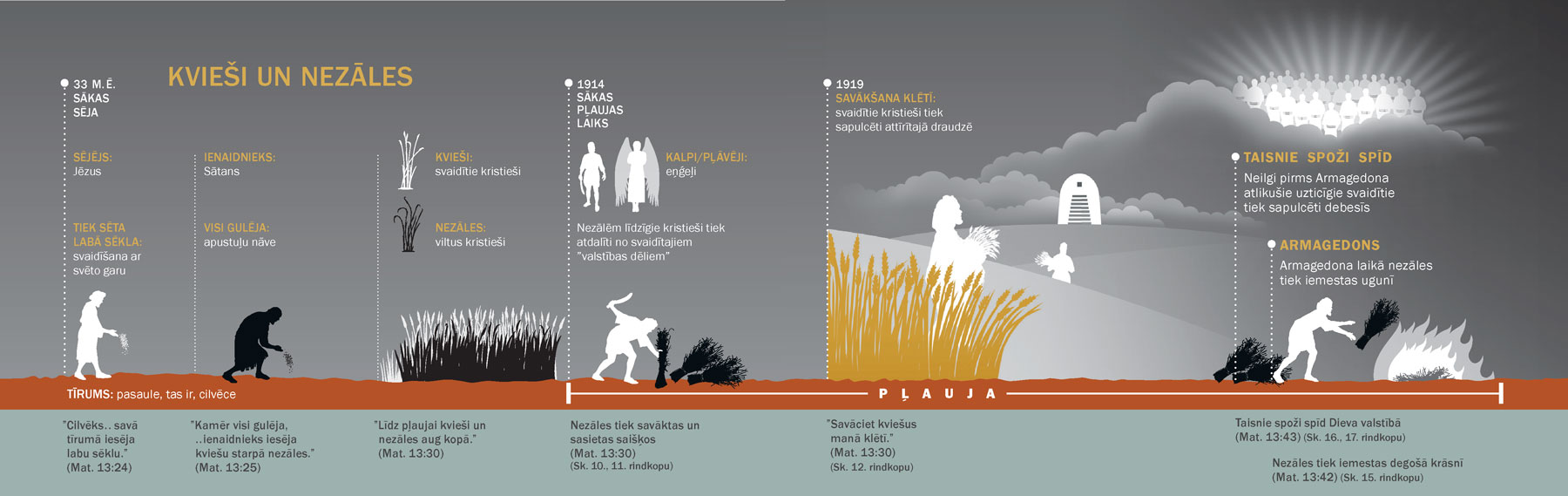10 Pirmais paredzējums: tiks savāktas nezāles. Jēzus norāda: ”Pļaujas laikā es teikšu pļāvējiem: ”Vispirms savāciet nezāles un sasieniet tās saišķos.”” Pēc 1914. gada eņģeļi sāka ”savākt” nezālēm līdzīgos kristiešus, nošķirdami tos no svaidītajiem ”valstības dēliem”. (Mat. 13:30, 38, 41.)
