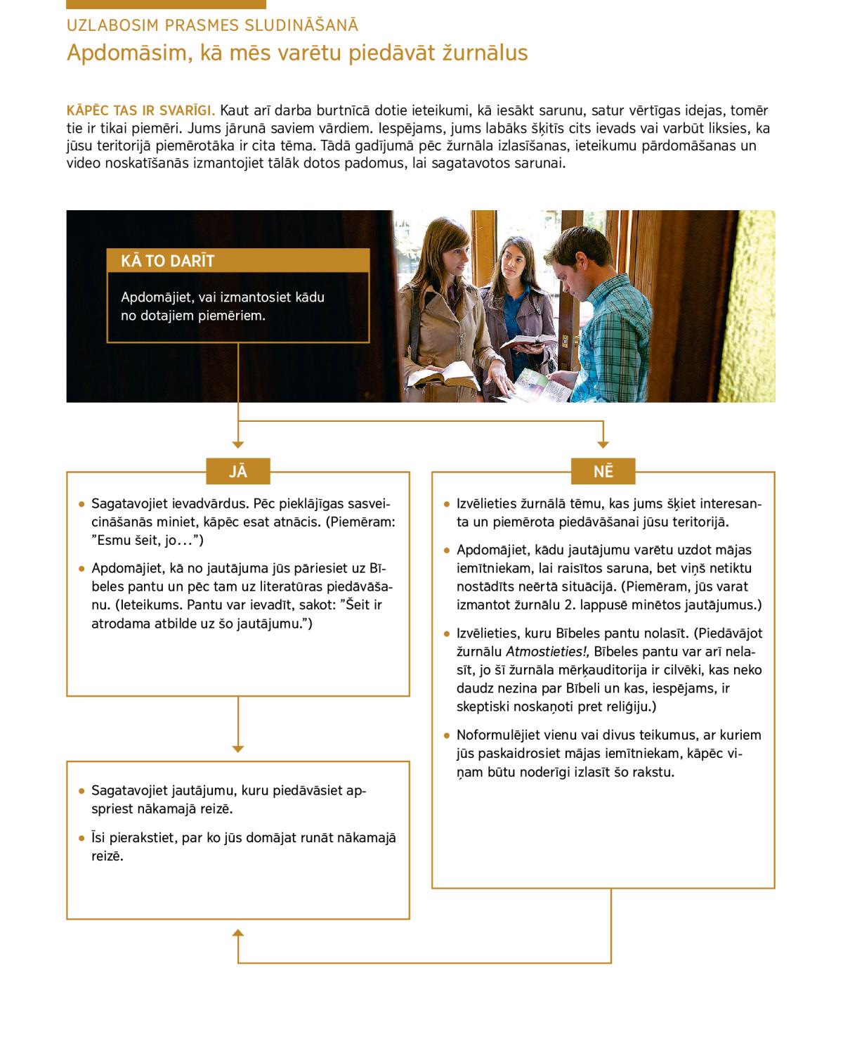 KĀPĒC TAS IR SVARĪGI. Kaut arī darba burtnīcā dotie ieteikumi, kā iesākt sarunu, satur vērtīgas idejas, tomēr tie ir tikai piemēri. Jums jārunā saviem vārdiem. Iespējams, jums labāks šķitīs cits ievads vai varbūt liksies, ka jūsu teritorijā piemērotāka ir cita tēma. Tādā gadījumā pēc žurnāla izlasīšanas, ieteikumu pārdomāšanas un video noskatīšanās izmantojiet tālāk dotos padomus, lai sagatavotos sarunai.