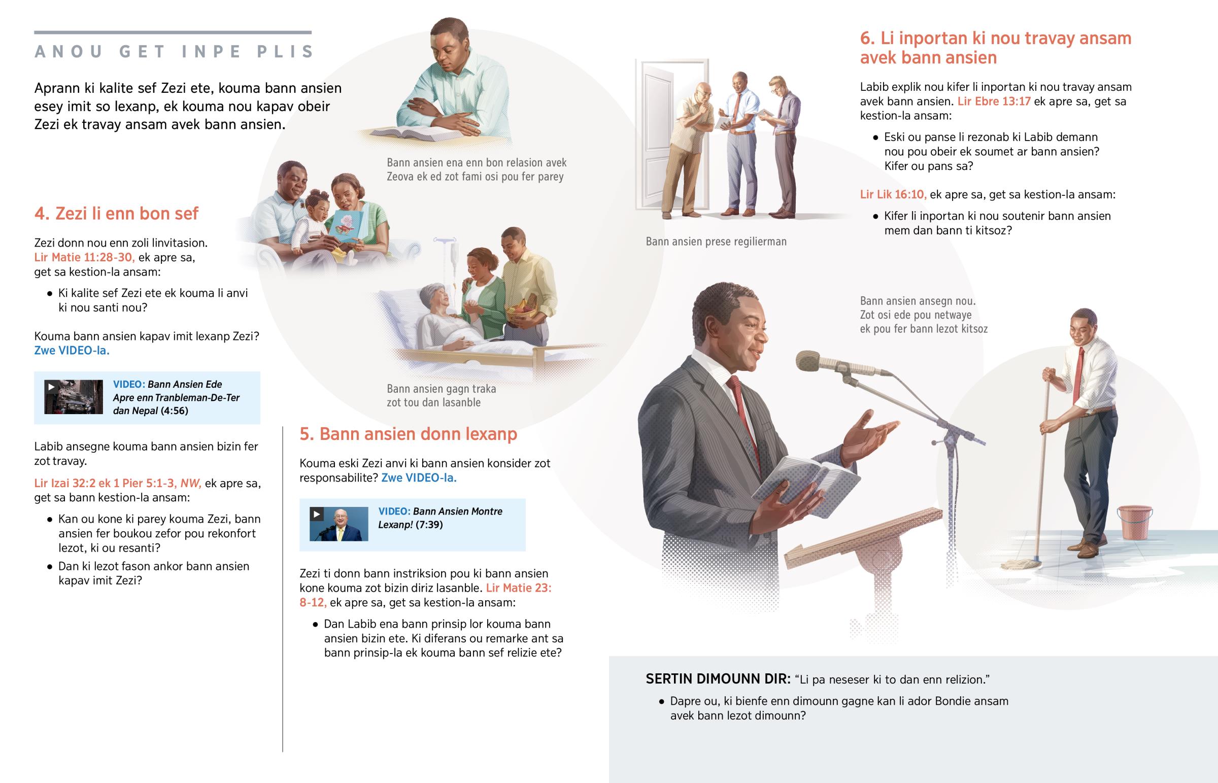 Aprann ki kalite sef Zezi ete, kouma bann ansien esey imit so lexanp, ek kouma nou kapav obeir Zezi ek travay ansam avek bann ansien.