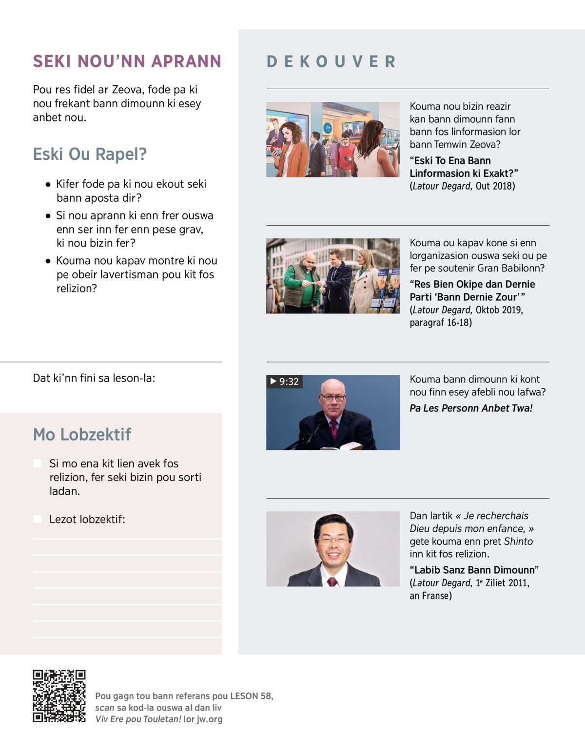 SERTIN DIMOUNN DIR: “Mo bizin kone ki bann aposta dir lor bann Temwin Zeova pou ki mo kapav defann laverite.”