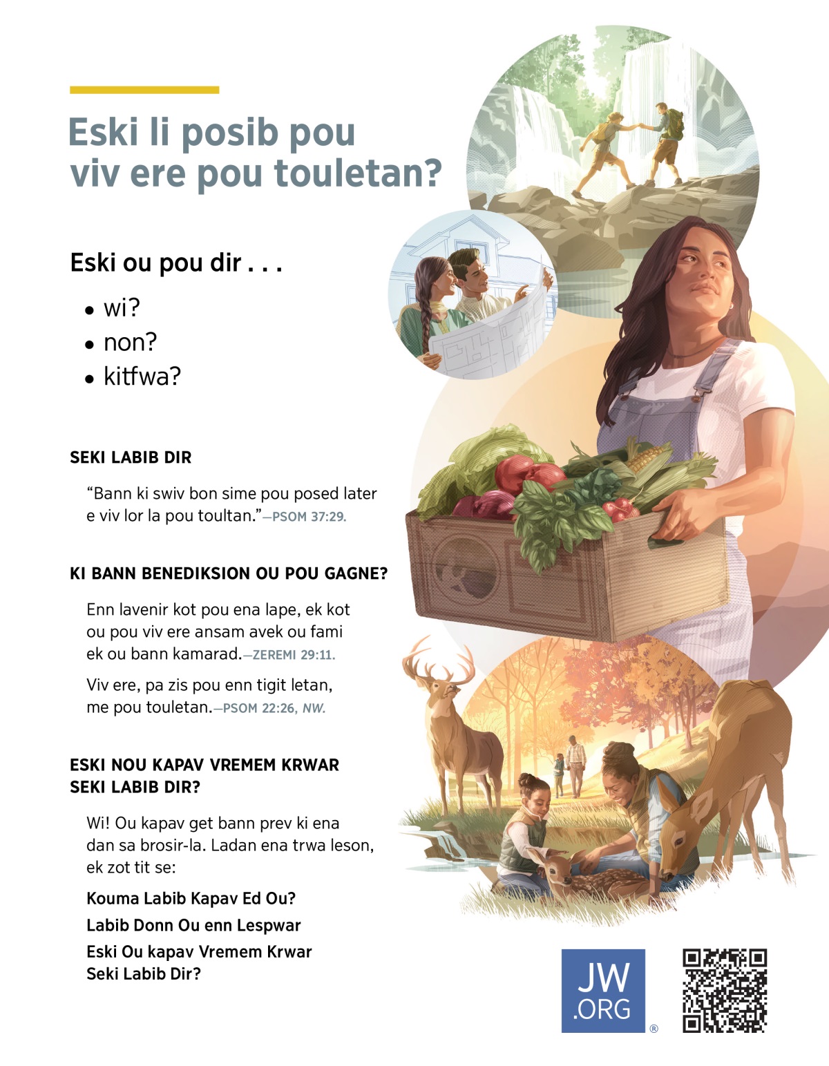 Enn lavenir kot pou ena lape, ek kot ou pou viv ere ansam avek ou fami ek ou bann kamarad.—ZEREMI 29:11.